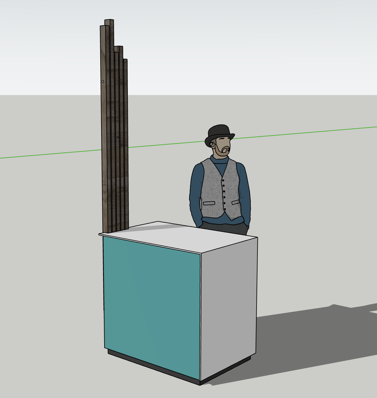 fai pavimenti in piastrelle grigine grandi e una luce ambiente da farmacia il piano del banco in corian bianco i listelli laterali lunghi devono arrivare a toccare il soffitto del locale alto 270cm