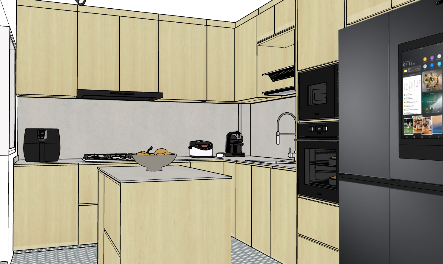pale yellow maple wood colour led strip lighting below top hung cabinet matt grey counter top and backsplash