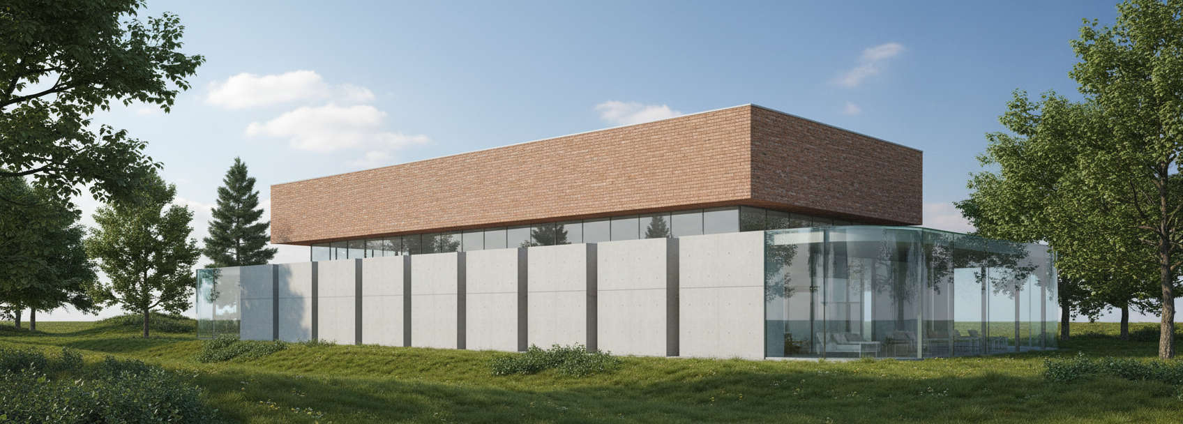 render the provided hand drawn architectural sketch as a realistic contemporary student housing building the hotel features a central parking deck with warm red brown brick cladding and glass curtain wall ends on both sides preserve the original proportions and geometry of the drawing place the building in a natural environment with mature trees landscaped greenery grass and subtle terrain variation use soft natural daylight realistic shadows and accurate material textures the glass ends should be transparent and reflective while the brick appears tactile and detailed overall style is modern professional architectural visualization calm and inviting atmosphere