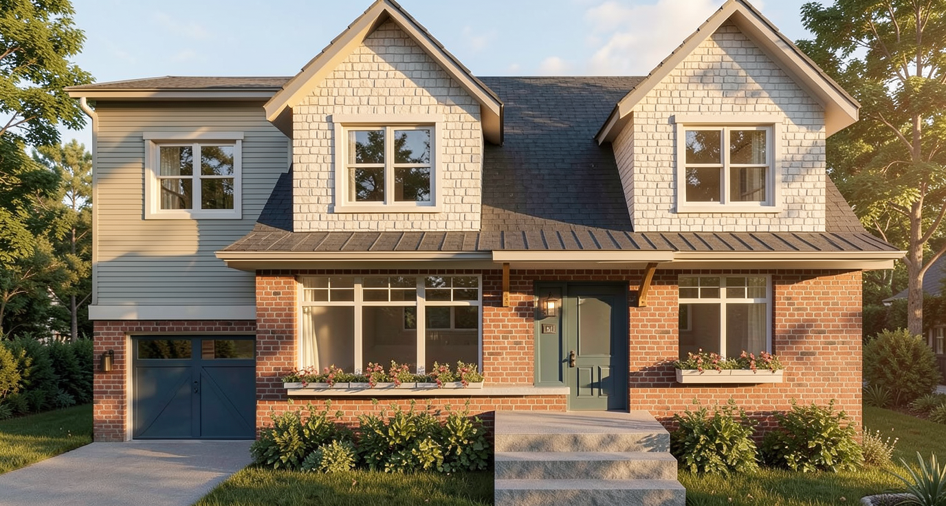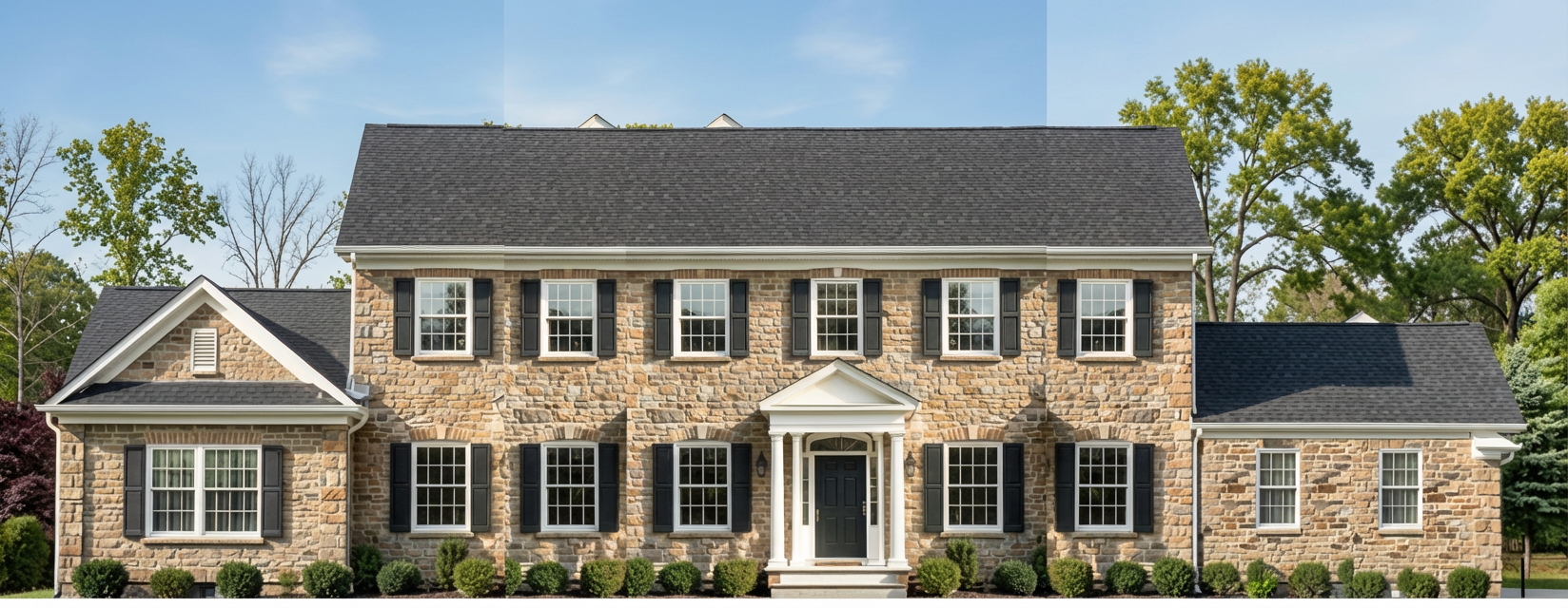 render a modern ranch style home with a serene atmosphere featuring a mix of classic stone and crisp white siding and stucco the roof is a sleek charcoal black adding depth incorporate large elegant windows with black frames surround the home with lush green grass and colorful shrubs vibrant greenery mixed with subtle lavender and deep burgundy hues the sky is a soft clear blue with fluffy white clouds creating a calm and inviting atmosphere