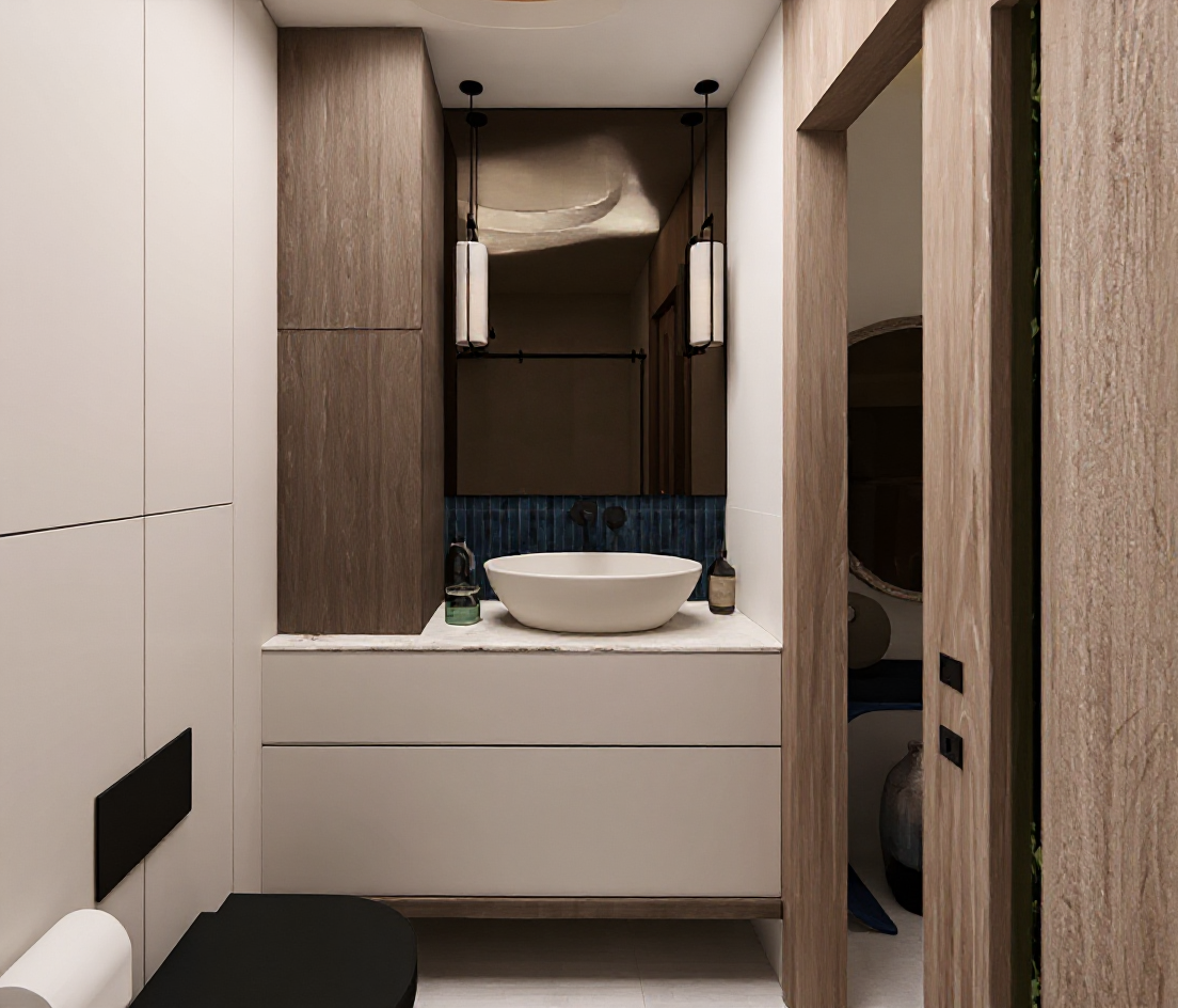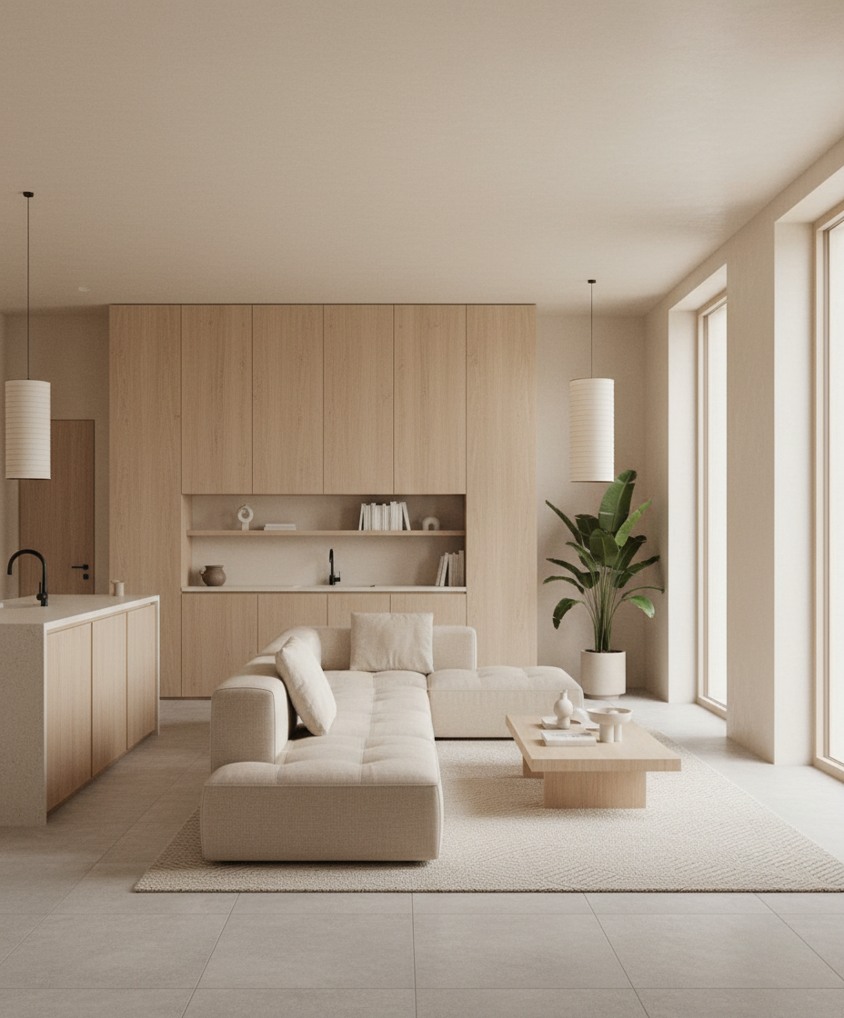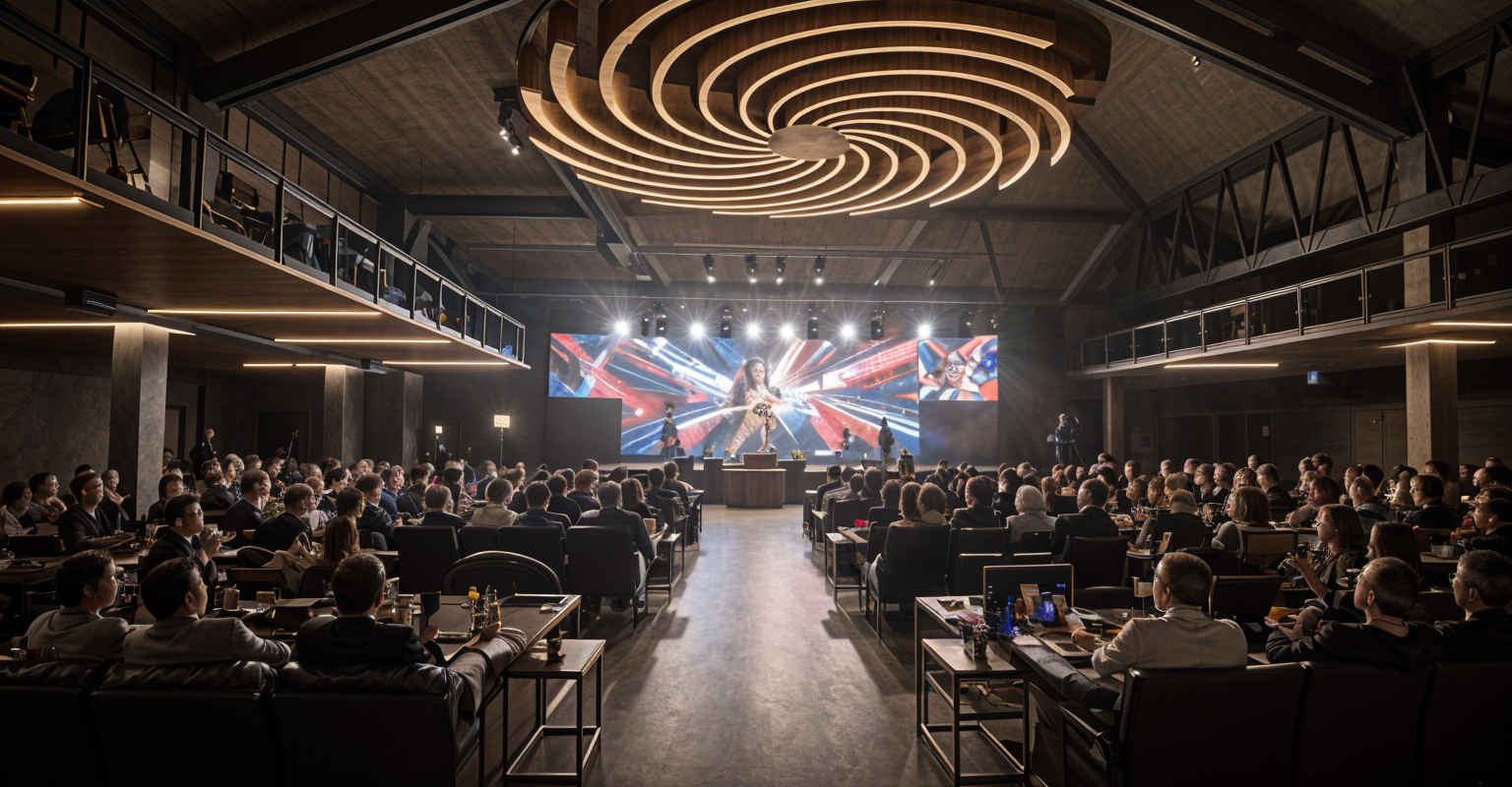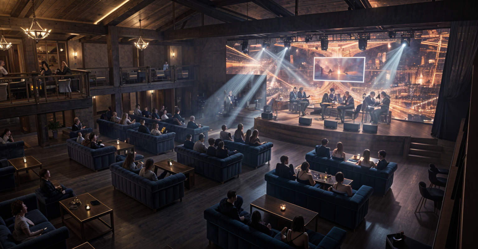 big bjarke ingels group wide angle shot convert this scene into a photoreal upscale nightclub in use at night viewed from the balcony closest to the stage preserve the exact architecture and proportions exposed steel truss system balcony railing stage shape and riser layout wood stage fascia rigging positions and the single led wall behind the performers do not alter the geometry or add new structural elements add dramatic stage lighting with visible beams and atmospheric haze as seen at a real concert beams should originate from the existing fixtures hung on the truss not invented locations haze should be subtle and realistic helping the beams read without obscuring the performers or making the room cloudy the single led wall must be present but not too bright reduce led intensity so it does not overpower the performers or wash out the room the wall should show one unified subtle abstract motion background calm and consistent across its entire surface no collage no logos no text no photographs no recognizable imagery integrate a simulated picture in picture imag window within the led wall content as if composited by a switcher feeding the wall the imag must appear as a clean rectangular overlay layered into the led signal not a separate physical screen absolutely no additional displays tvs or monitors anywhere in the room populate the venue with upscale lounge seating on the floor level and upper balcony areas furnishings should be premium and modern tufted leather and velvet seating dark wood tables brushed metal accents add a denser affluent audience filling the space all patrons must face the stage and pay attention to the performers engaged and focused no one using phones no distractions no clutter maintain polished concrete flooring with soft reflections lighting should be warm and architectural throughout the house with the ceiling feature subtly lit if visible from this angle overall mood is modern exclusive energetic and visually impressive like a high end concert in a premium nightclub architecture