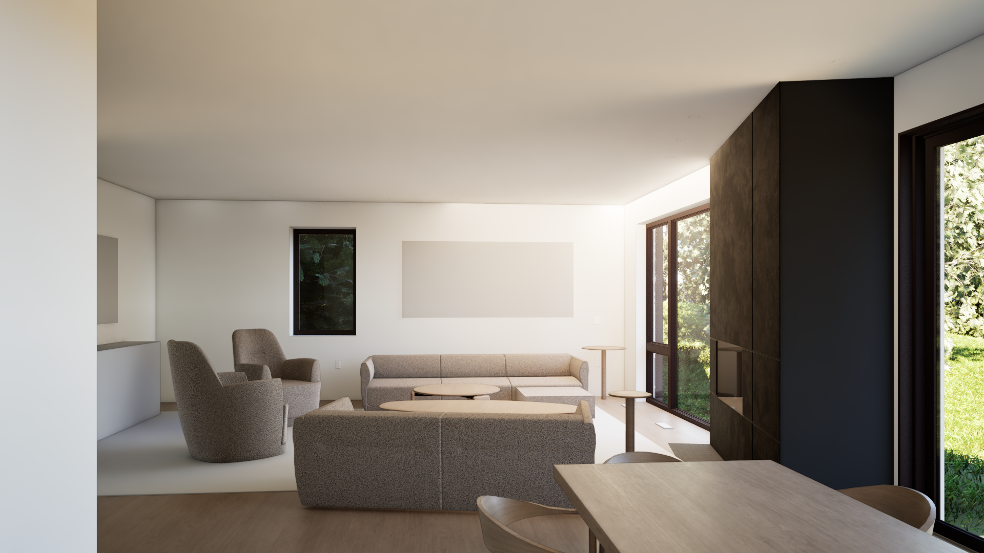 add fire to fire place neutral rug under furniture in the living room replace left box in living room with a wood credenza and tv above it put art above couch in living room