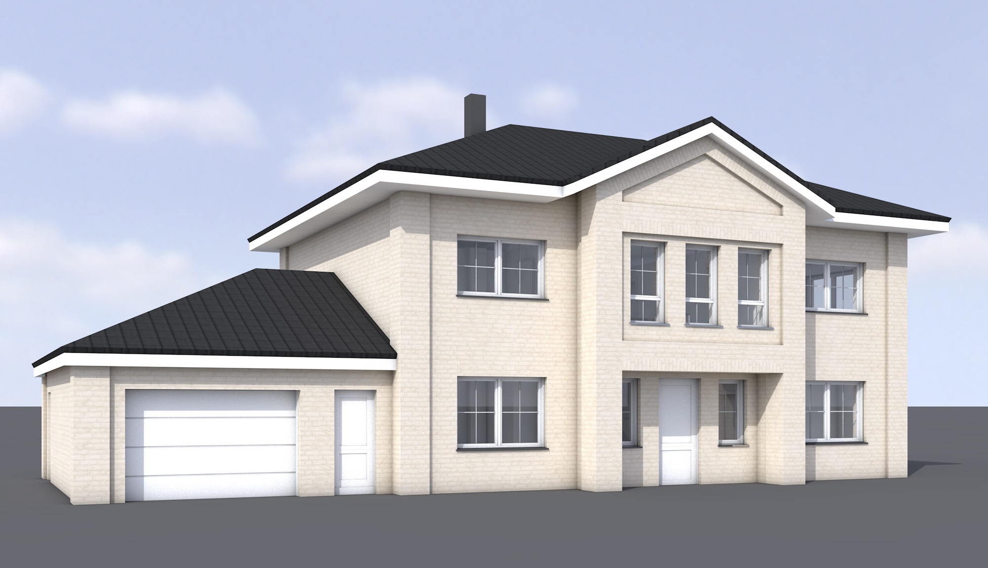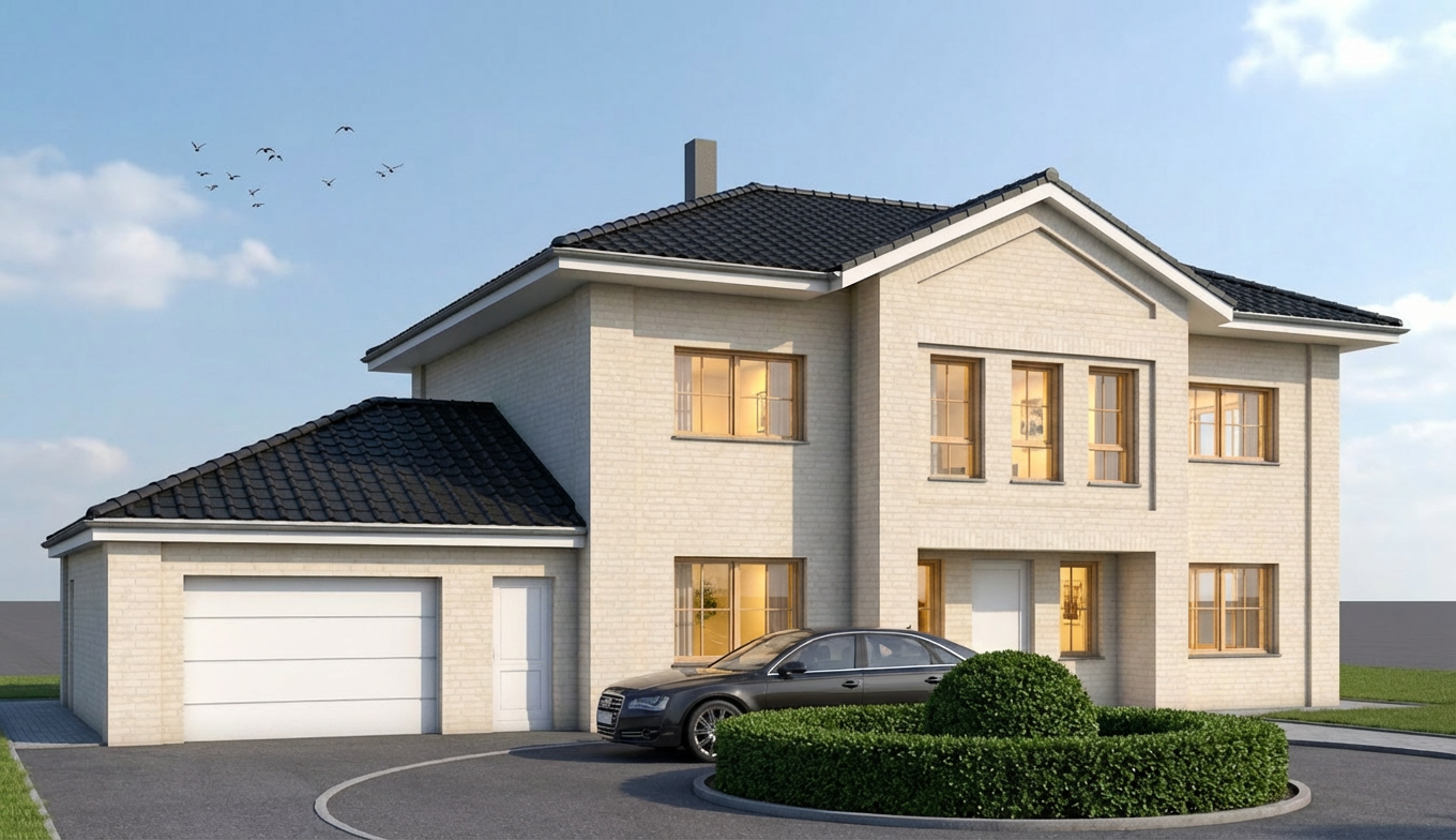 only some birds on sky shiny day black roof tiles little boxwood circle in front of the house car drives in circle some lights in the house windowframe in white