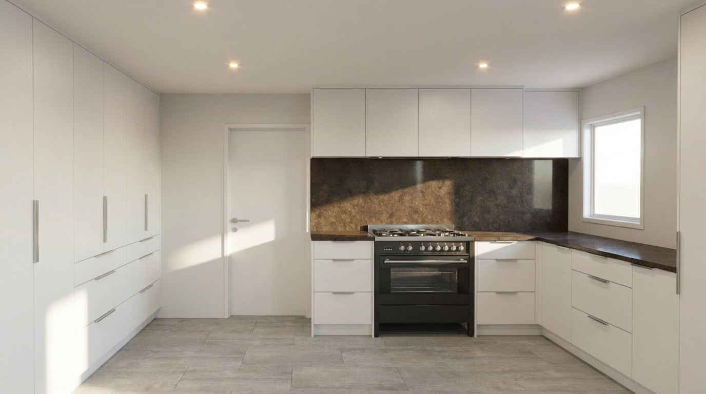 contemporary interior shot keep perspective as is event room no furniture windows on the far left and far right walls featuring an elegant stage with 3 steps atmospheric backlight the room lighted with elegant artificial light all finishes in neutral tones simliar to white alabaster architecture