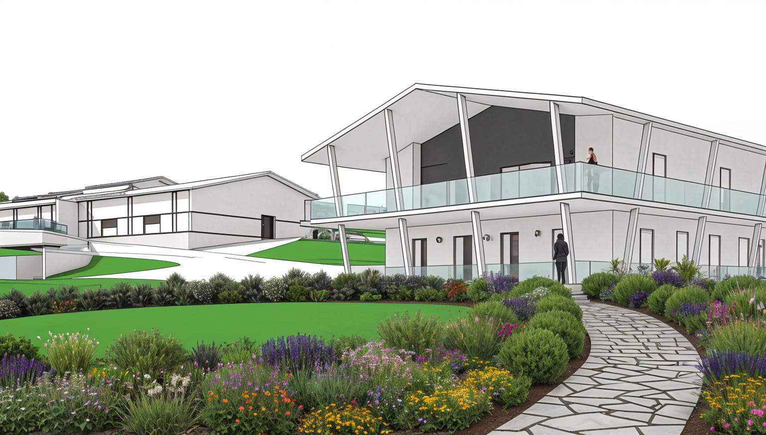 photorealistic architectural rendering modern house facade with vertical natural slatted wood and smooth grey walls light grey standing seam metal roof neutral minimal background soft grey or white no sea or landscape enriched landscaping with shrubs low flowers and ornamental bushes high resolution ultra realistic lighting and textures architecture