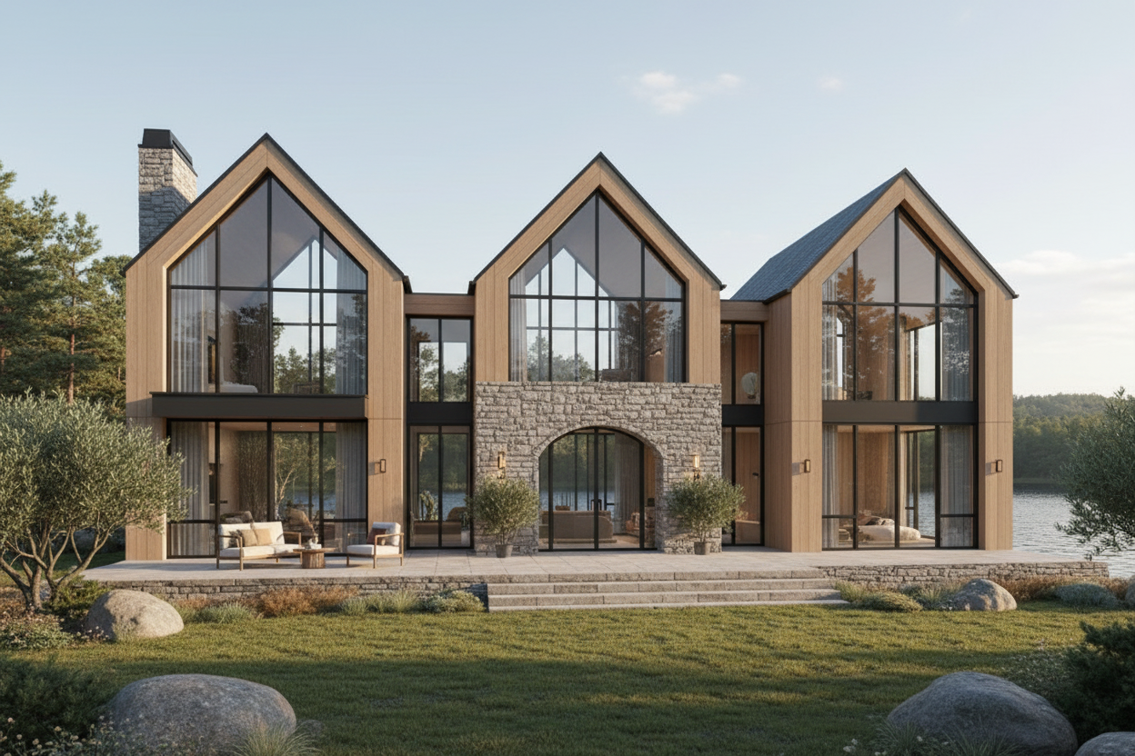 lake house mediterranean warm cozy vibes luxury minimalist natural materials stone and wood floor to ceiling windows on the front facade 3600 square feet sloping lot facing a lake