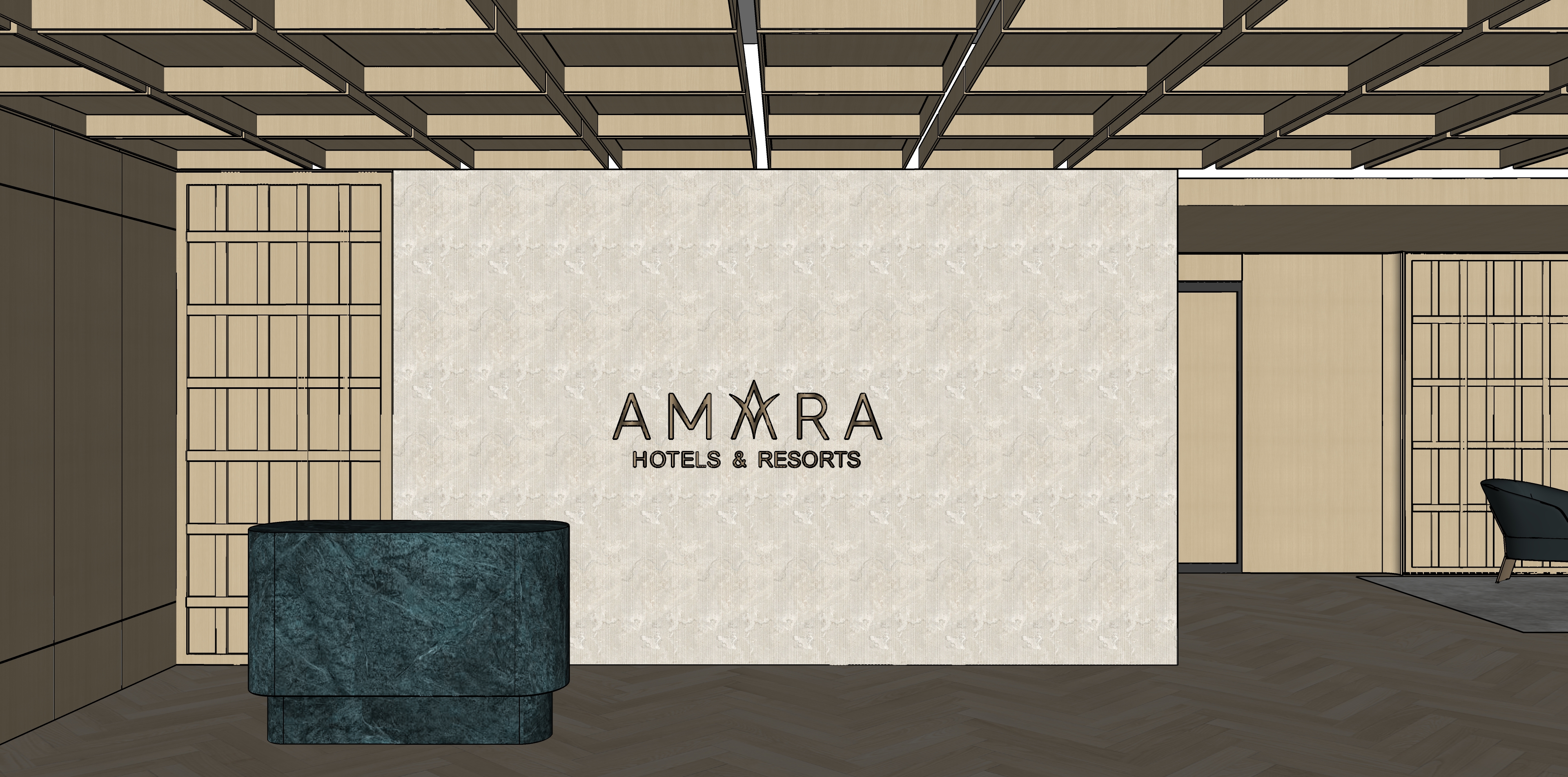 render a modern hotel lobby featuring a sleek reception desk in rich teal with a marble texture the back wall is adorned with a subtle cream decorative pattern displaying elegant modern typography in dark brown the floor showcases a dark wood herringbone pattern and the ceiling has a warm beige grid design include ambient lighting for a luxurious serene atmosphere and ensure the overall color palette maintains a sophisticated balance of teal cream beige and dark brown exuding comfort and elegance