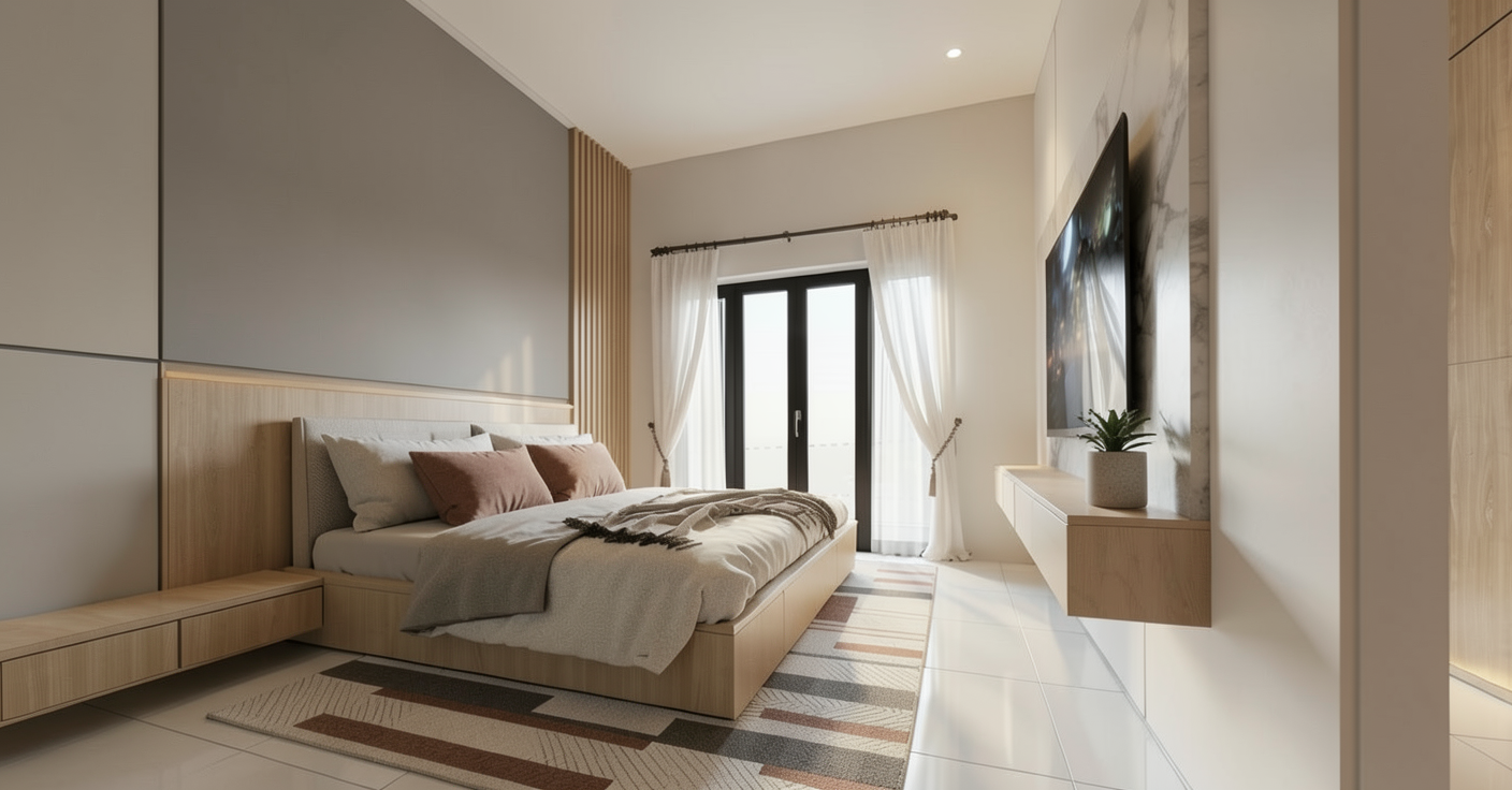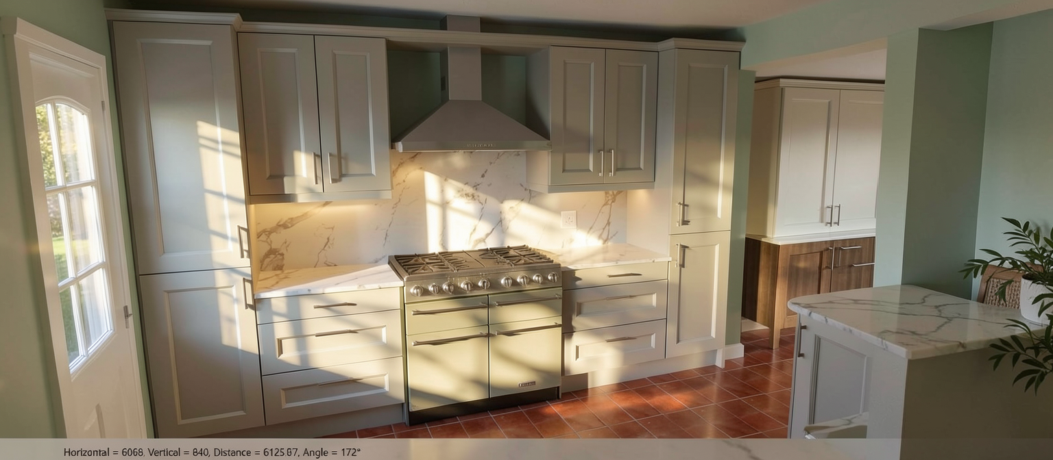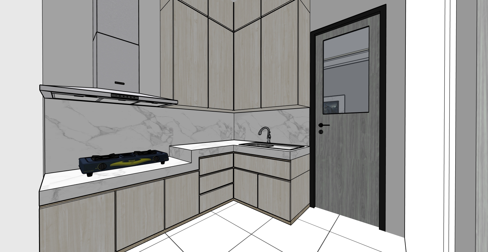 dont make changes to the model keep the exact geometry layout cabinet configuration door position appliance placement and ceiling design and the initial material shown in the model exactly as shown photorealistic architectural interior render of a modern minimalist kitchen with warm neutral tones and scandinavian japanese inspired design kitchen with light wood cabinetry for both upper and lower cabinets clean minimalist flat panel doors and subtle wood grain texture countertop and backsplash made of white marble with soft grey veining forming an l shaped kitchen counter exactly following the model layout built in range hood above the cooktop a single gas stove placed on the countertop and a minimalist stainless steel sink with faucet integrated into the corner counter clean light tiled flooring with subtle reflections door beside the kitchen must remain greyish wood material with matte black frame and matte black handle exactly following the design shown in the model including the glass panel on the upper part of the door soft natural lighting realistic material textures realistic wood grain marble surface details soft shadows global illumination photorealistic architectural visualization dont add led strip lighting on the bottom of the top cabinet