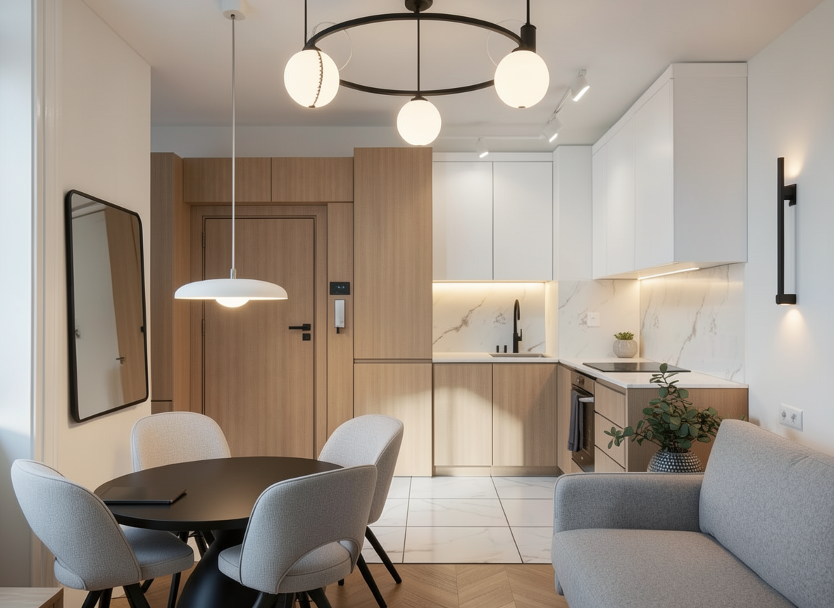 colours and texture to remain accurate as per original picture kitchen in tiles living room in muted light brown vinyl in between kitchen and living in dark maroon marble large tile hello lightbox countertop in dark maroon marble walls in off white subtle texture door in dark maroon purple plain laminate top hung at shelvings in dark maroon purple plain laminate 4 small squares backing in dark maroon purple plain laminate