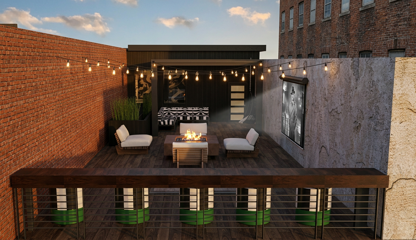 add patio lights and show space at golden hour the grey rug on the ground is a sky light