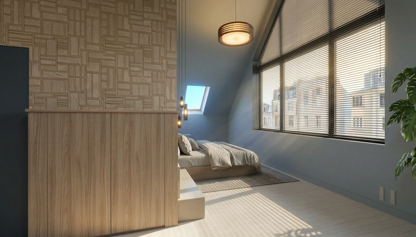 add some details and make it realsitic the wall behind the bed has two led stripes that light the wallpaper not the bed do not change any material