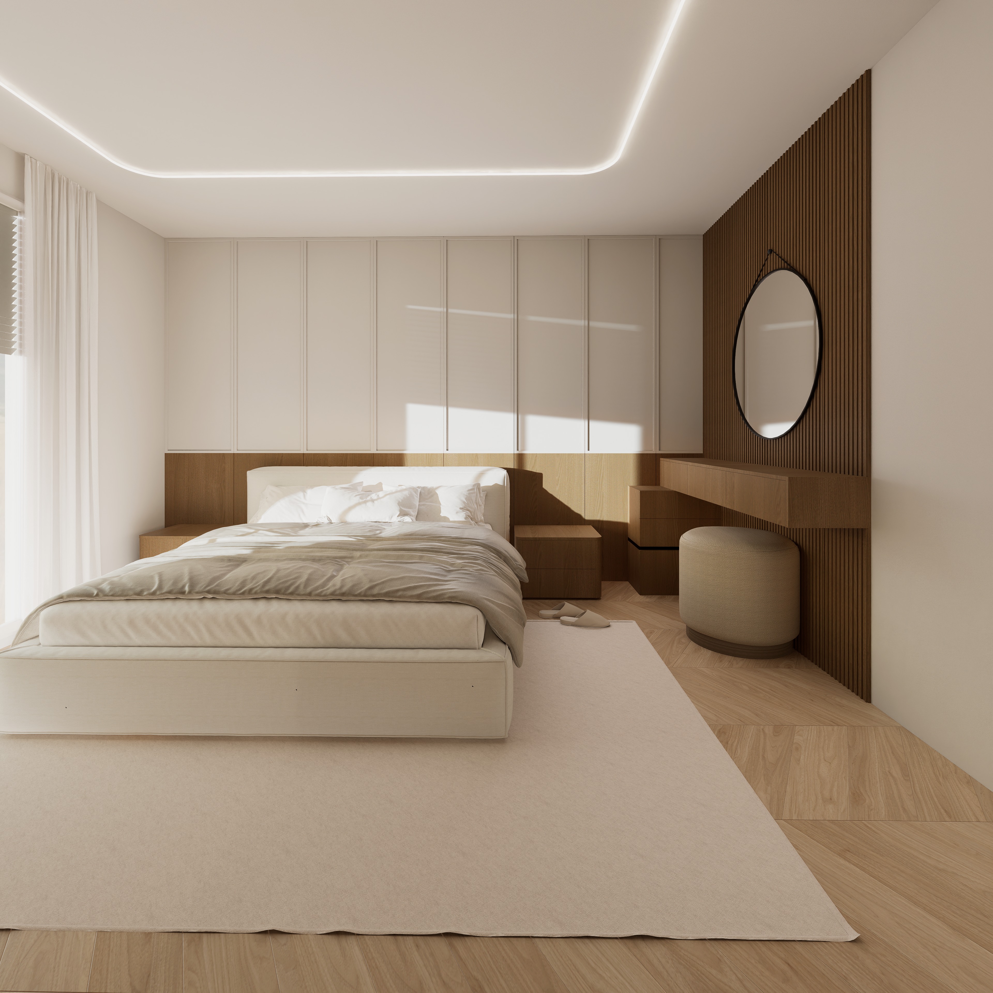 ultra realistic interior render of a modern minimalist bedroom do not change the design layout proportions materials or camera angle enhance realism with physically accurate lighting and textures bed upholstered in soft cream fabric slightly textured with subtle wrinkles and natural folds bedding layered neutral tones white warm beige realistic fabric creases soft cotton linen feel headboard wall upper panels matte cream finish with clean vertical divisions very subtle shadow gaps lower section light oak wood paneling matte finish natural grain right wall feature vertical wooden slats in warm walnut tone rich grain matte satin finish floating vanity same walnut tone minimal design clean edges mirror round thin black frame slightly reflective but not mirror sharp pouf soft fabric upholstery in warm neutral tone slightly textured rug large soft off white carpet subtle fibers slightly uneven edges for realism flooring light oak wood in herringbone pattern matte finish with natural variation lighting ceiling indirect led strip 3000k warm white soft continuous glow strong natural sunlight entering from left side casting soft directional shadows on bed and wall balanced exposure preserve highlights avoid overburn realism details natural sunlight shadows across bed and panels keep soft but defined micro imperfections on wood and painted surfaces subtle ambient occlusion in corners and under furniture slight fabric compression on mattress and pillows objects keep minimal styling slippers decor refine materials for realism no clutter clean high end look overall warm calm premium atmosphere high end architectural visualization quality slightly cinematic with natural contrast no over sharpening no artificial glow