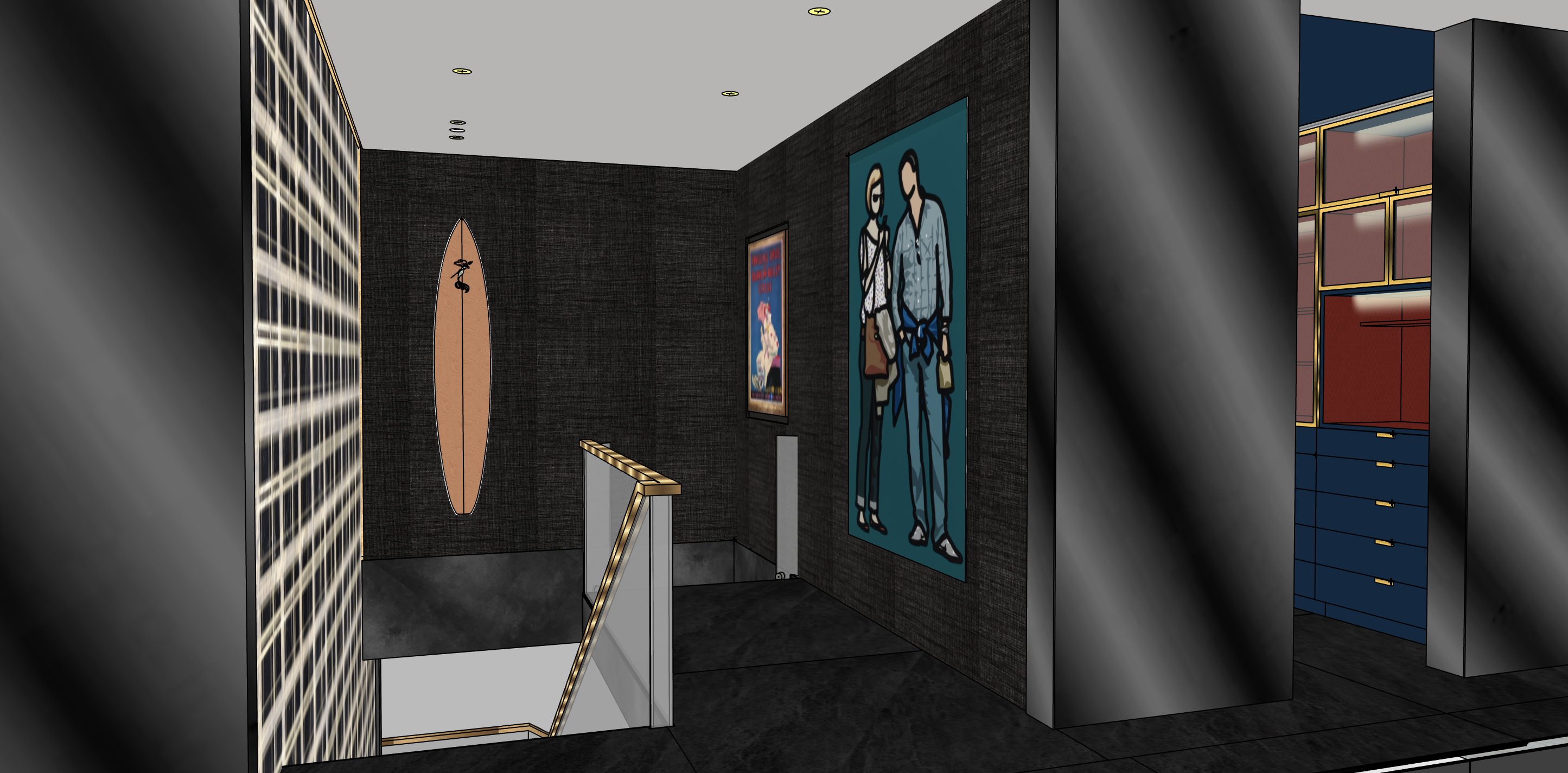 soft glow from left side wall simmer and textured dark wall paper on back wall smoked black mirror walls on right and left side walls of image