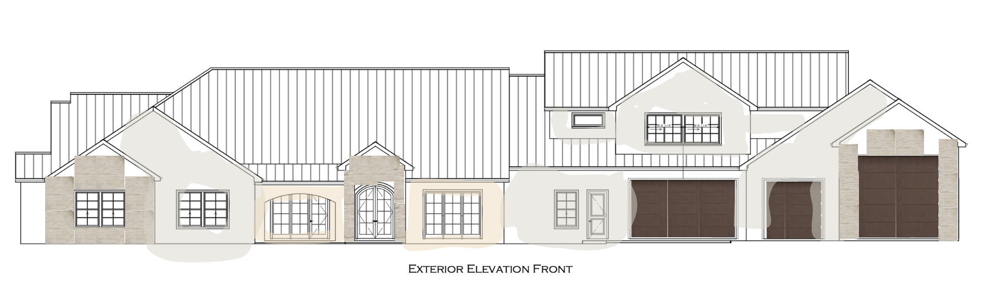 creamy stone on the ends creamy stucco on the large portions of the house in the very middle have vertical light wood creamy stone over the front door black roof and windows keep the house the exact same do not alter garages or windows