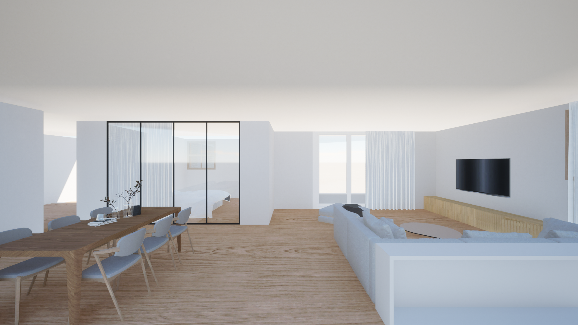 make a photorealistic 3d image of this modern flat light wood flooring and and white furniture
