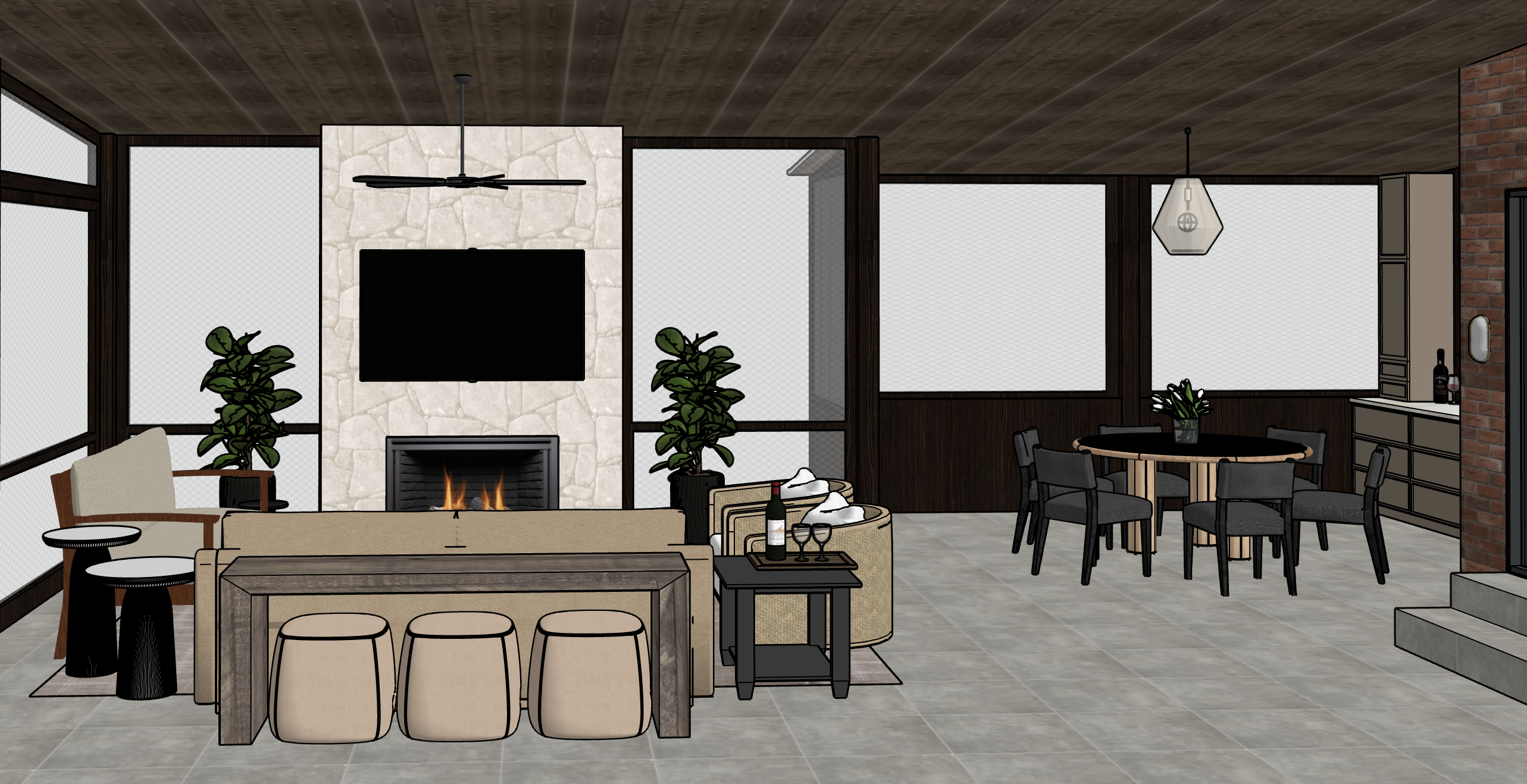add a backyard scene outside of the screens and render in late morning daylight lighting add brass hardware to the cabinetry