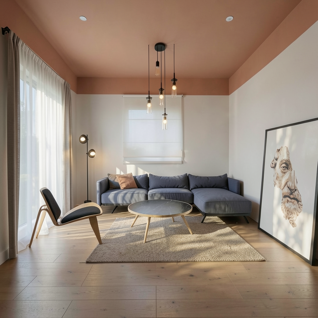 convert this floor plan into a realistic isometric 3d view of a full house show the space from an elevated angle with furniture walls and details visible render a beautiful apartment interior based on a blueprint layout use calming earth tones for the walls like soft beige and sandy taupe incorporate rich wooden textures for the floors and furniture with a warm oak finish create a cozy and inviting atmosphere with ambient lighting in soft white tones use neutral grays and whites for kitchen and bathroom fixtures and add touches of greenery for a natural feel ensure the space feels spacious and serene with a sense of modern elegance throughout the design use the same furniture as shows on the plan do not change the orientation of the floorplan remove words