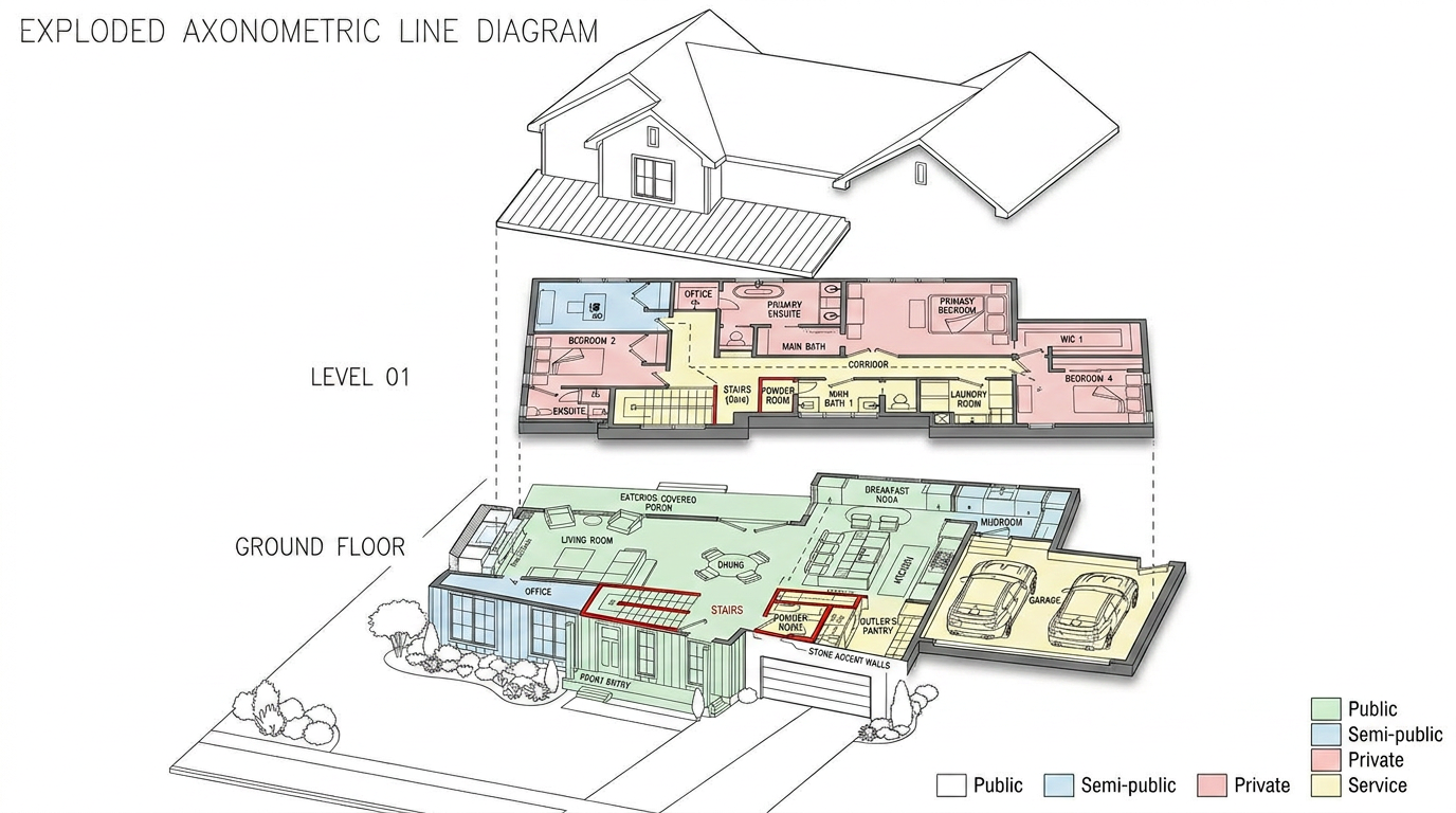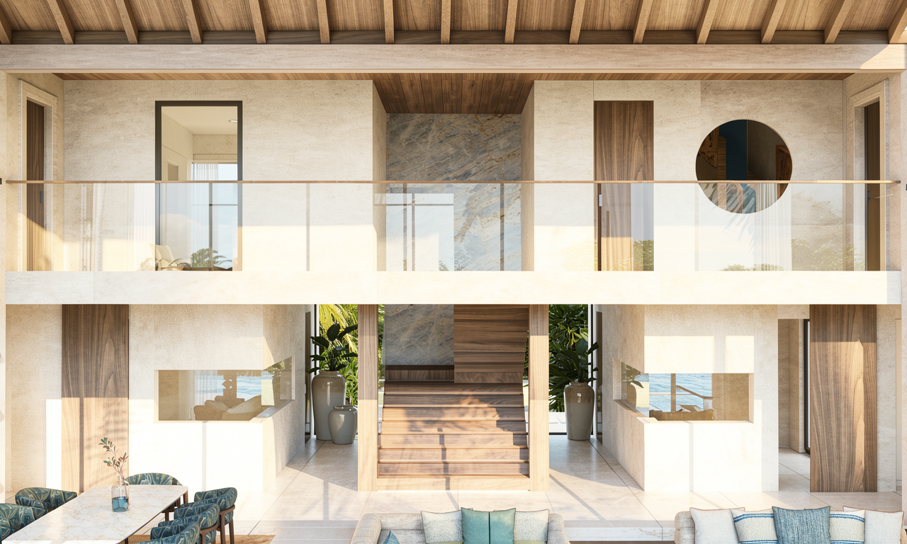 enhance this render into a soft photorealistic coastal scene while preserving all architectural details materials furniture placement camera angle and composition exactly as shown do not change the design layout landscaping or colors