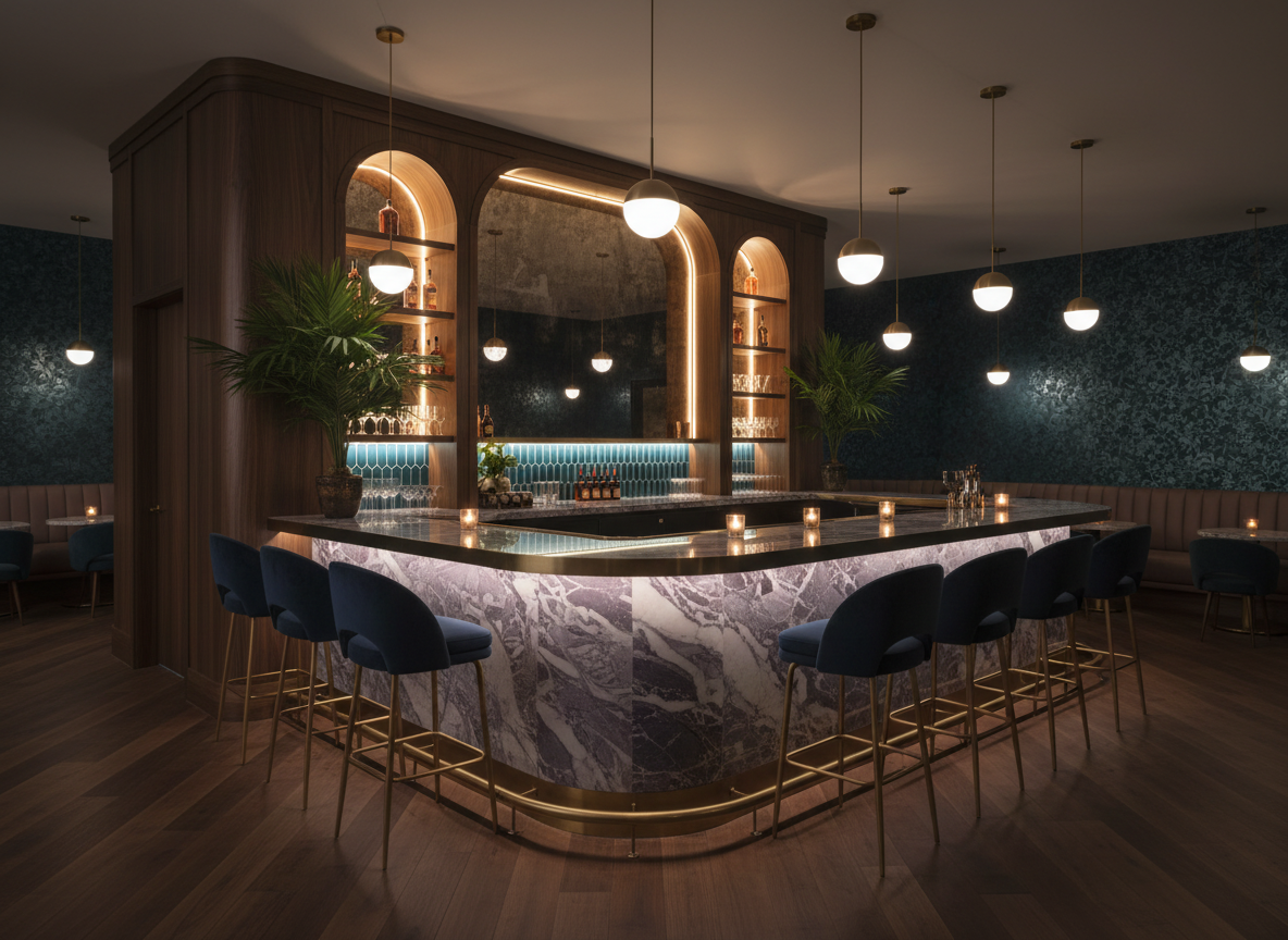 exterior shot award winning boutique hotel bar curved island bar purple cream and blush pink marble with antique smoked glass panels and brass reveals floating brass shelves teal zellige tile backsplash art deco fan back stools with fluted brass pedestal base and navy velvet seat dark teal botanical wallcovering mauve channel tufted banquette palm plants brass globe pendants herringbone walnut floors candlelight