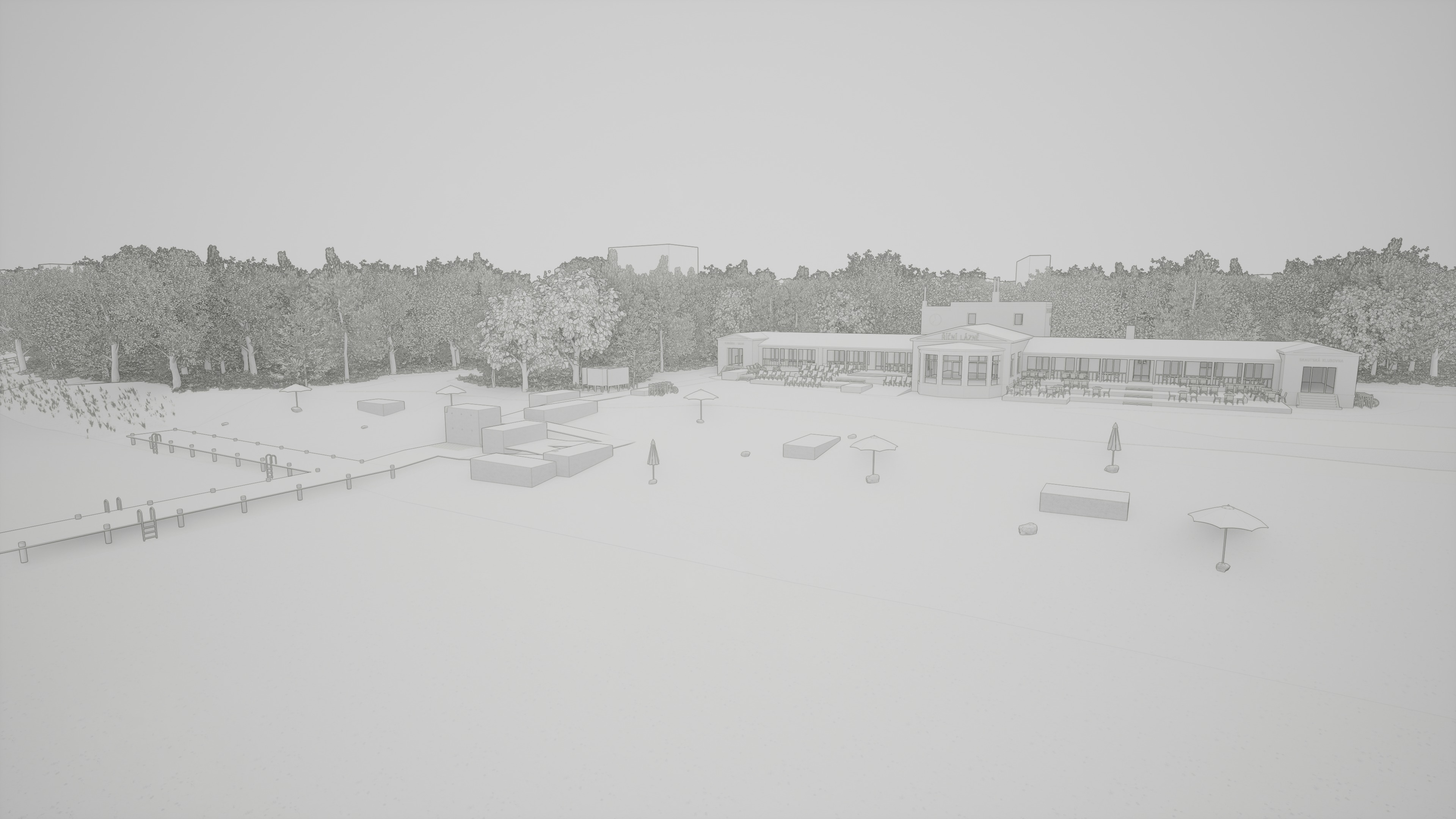 nordic perspective shot the house is from the 1930 and now is newly reconstructed the house has a rocky path and beach in front of it bit farther away from the building it is a river spa with a broadleaves forest behind it the roof is made of metal sheets of brick red color most of the walls are in creamy white plaster terraces in front of the building are made of timber the house has a pebble beach in front of it the river is farther away the very end of the building on the left side under the a roof has a facade made of rough concrete architecture