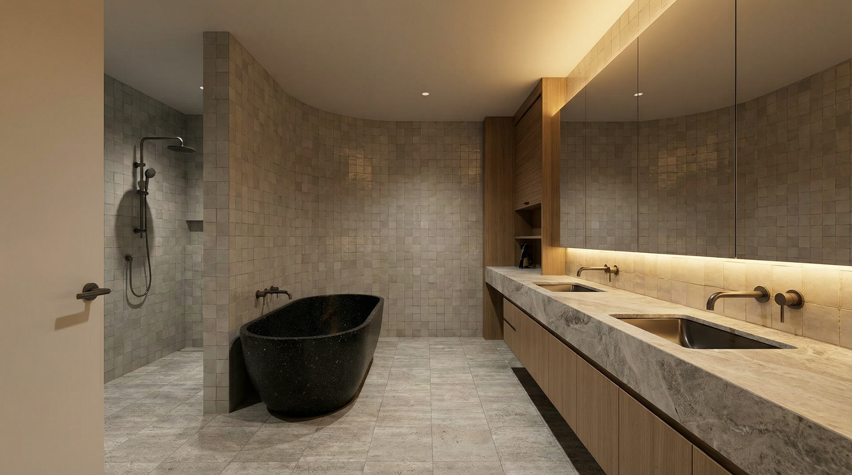 a serene architectural visualization of a minimalist contemporary house viewed from a small quiet street at the edge of a lightly wooded dutch forest landscape the building consists of clean horizontal volumes the upper volume features a fa ade finished in smooth stucco rendered in a warm light grey tone the lower level is clad in narrow black wooden planks creating a refined and grounded contrast with the upper volume window frames and doors are executed in refined graphite black the house is partially embedded into a gentle slope with the lower level visually anchored to the terrain a covered entrance is carved beneath the upper volume on the left side of the composition a driveway slopes downward from the street toward the house paved with traditional red clay brick pavers in the foreground soft natural grass and low vegetation dominate the scene creating an open and calm transition from the street to the dwelling in the background a mix of taller trees typical of a dutch forest such as oak beech and pine rise above the house providing depth while remaining loosely spaced and not overly dense an outdoor terrace extends from the house into the landscape finished with large format concrete paving slabs in a natural grey tone natural subdued color palette muted greens of grass and foliage warm light grey stucco black stained wood cladding graphite black frames soft grey concrete and red brick accents in the driveway overcast daylight with diffused soft lighting enhancing a calm atmospheric mood photorealistic architectural rendering eye level perspective from the street slight depth of field high detail textures realistic shadows emphasis on integration with nature spatial calm quiet luxury contemporary northern european architectural language cinematic realism landscape finished with large format concrete paving slabs in a natural grey tone natural subdued color palette muted greens of grass and foliage warm light grey stucco graphite black window frames soft grey concrete and red brick accents in the driveway overcast daylight with diffused soft lighting enhancing a calm atmospheric mood photorealistic architectural rendering eye level perspective from the street slight depth of field high detail textures realistic shadows emphasis on integration with nature spatial calm quiet luxury scandinavian contemporary architectural language cinematic realism
