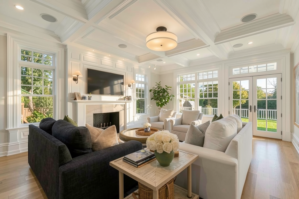 transform the provided sketchup dining room scene into a hand rendered grainy architectural watercolor illustration maintain the original layout proportions and camera angle clean precise black ink linework defining furniture edges cabinetry window frames and architectural details soft watercolor washes layered over the drawing warm walnut wood tones for the dining table and sideboard muted forest green accent wall warm white walls and soft beige upholstered chairs natural light entering from the large glass doors rendered as soft diffused watercolor gradients with gentle shadow washes on the floor subtle texture of watercolor paper visible slight color bleed at edges light fading into white around the perimeter for an airy presentation board aesthetic loose but controlled brushwork transparent layered washes minimal clutter artistic architectural illustration style