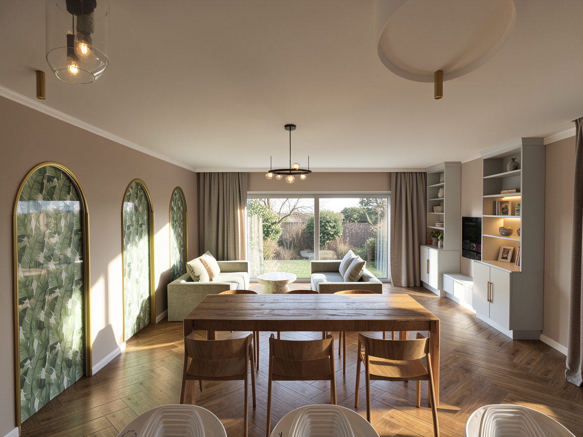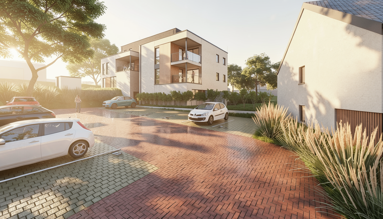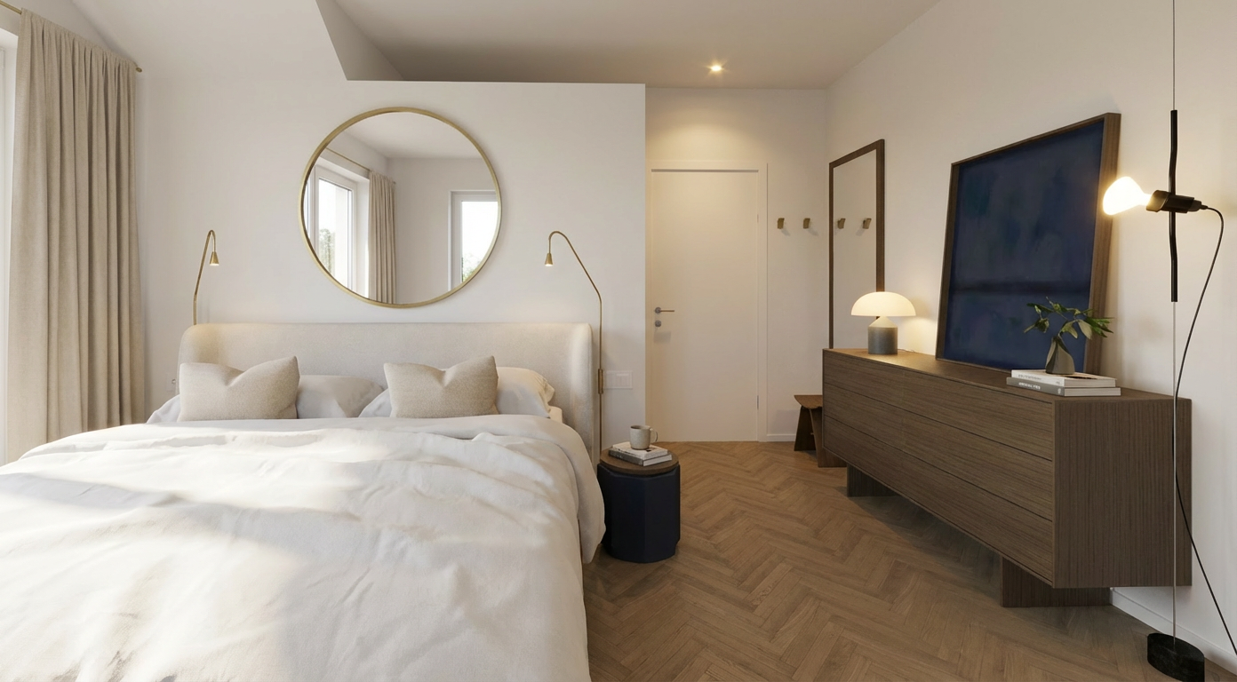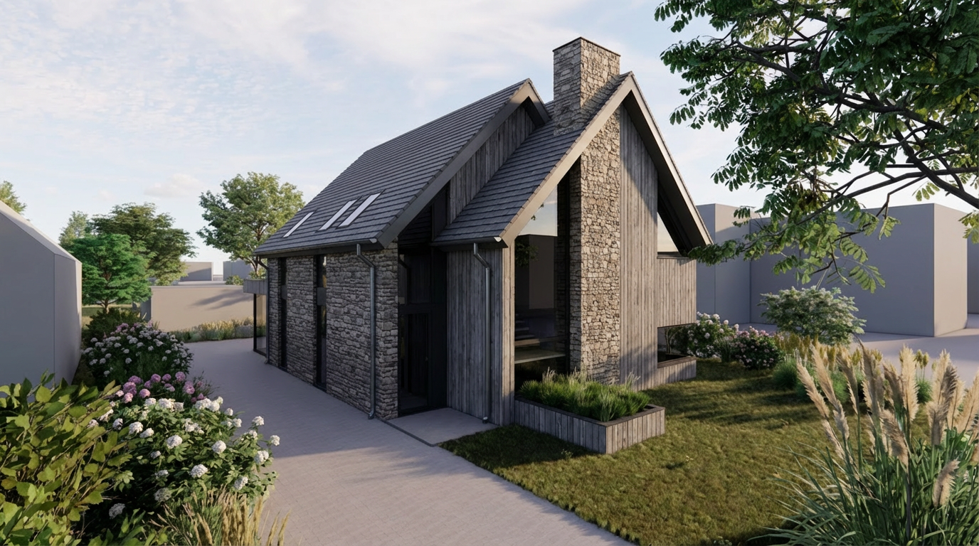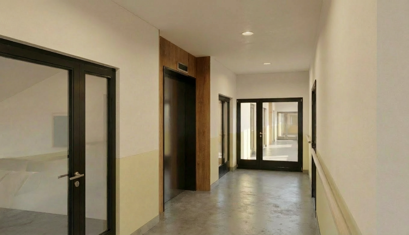 do not modify any part of the image except the elements listed below add soft interior lighting visible through the windows keep the light subtle and not too intense apply a uniform marazzi grande resin look bianco ceramic facade texture with a clean matte finish no visible patterns or veining divide the facade into large format ceramic panels with minimal clean and widely spaced joints avoid small or dense panel divisions