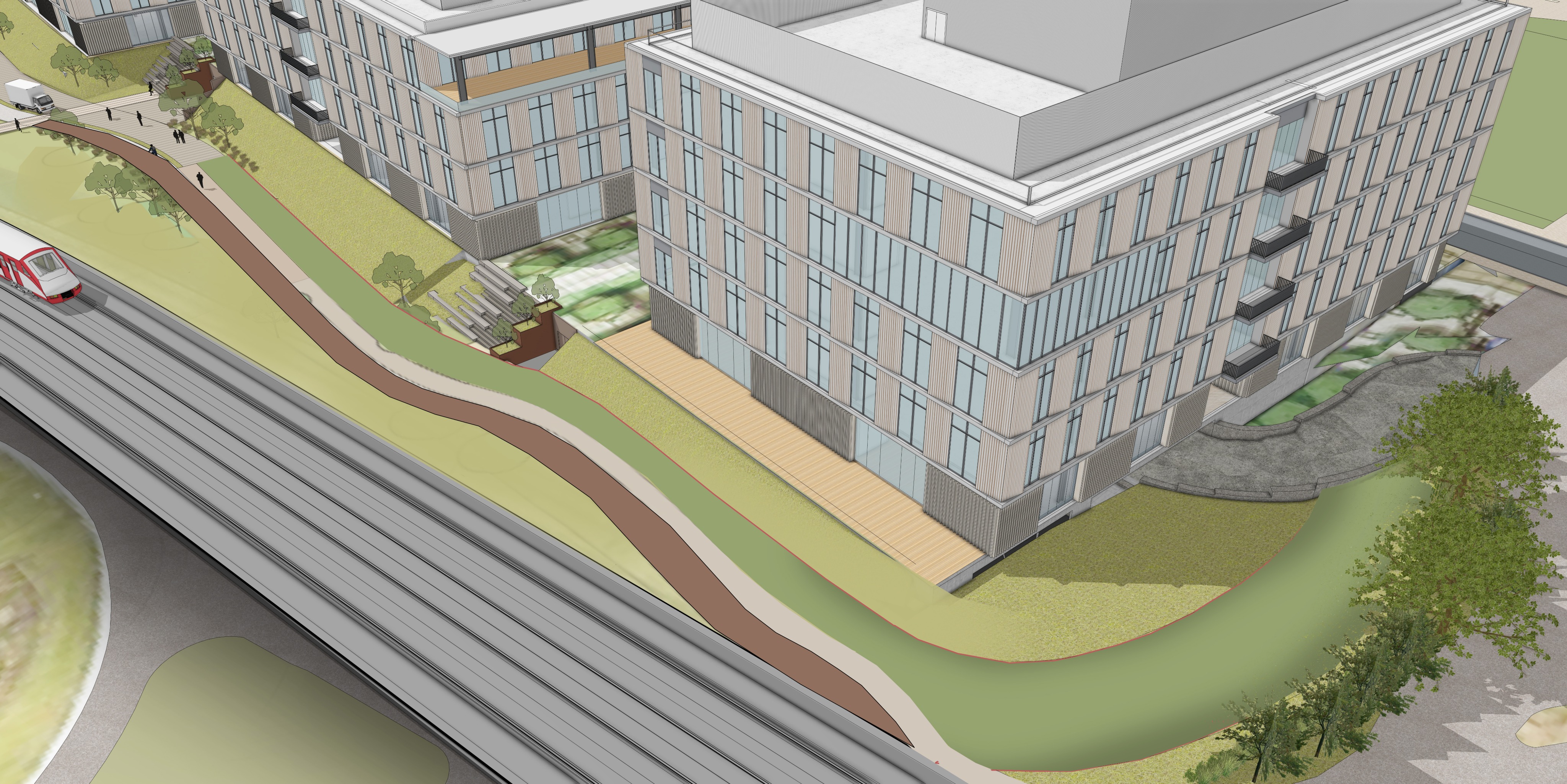 do not change view angle sunny day southern facade of buildings create a stunning aerial view show a modern commercial development buildings to have light metal panel facade with portions of large clear glass not every building is identical some buildings are all glass facade trolley line from above blurred effect of trolley add modern landscaping and trees preserve all pathways portion of firelane is grasscrete