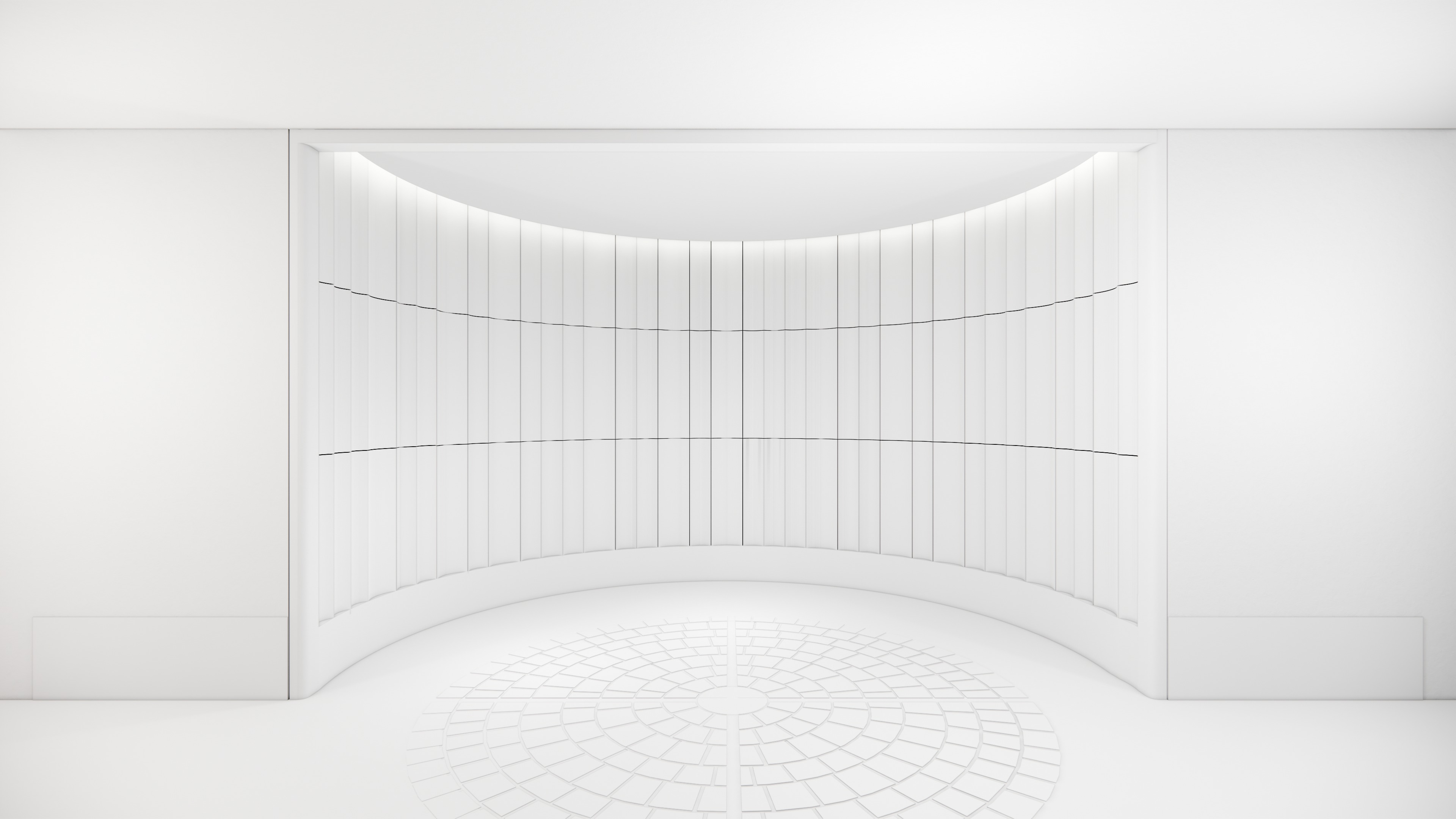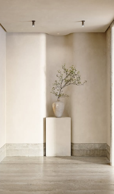 exterior shot keep exact geometry apply a warm minimal monolithic material palette inspired by honed travertine and limestone use soft beige tones with subtle natural veining and slight imperfections walls and reception desk in continuous stone finish with low contrast variation introduce vertical fluted wall panels with deep evenly spaced grooves creating soft shadow rhythm maintain clean edges and precise craftsmanship lighting soft diffused ambient lighting with gentle top down wash add a small sculptural table lamp with a warm glow milky white diffuser creating a focal point without overpowering the space add suspended abstract metal sculpture thin curved rusted steel elements hanging from thin cables slightly asymmetrical and organic floor light stone or microcement with subtle texture matte finish overall mood calm refined tactile museum like minimalism soft shadows no harsh contrast no glossy finishes
