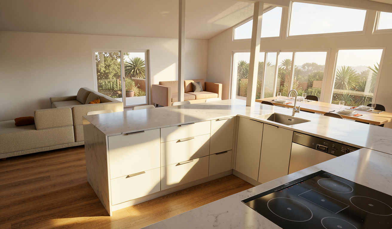 create a modern dining room and adjacent kitchen featuring a spacious walnut table surrounded by elegant walnut chairs with black leather cushions the atmosphere is warm and inviting enhanced by rich walnut and glass cabinetry and there is an ocean view reflected in the glass mirror incorporate white walls and a light marble backsplash in the kitchen the kitchen cabinets are a white satin finish and color add a large window with black frames to allow natural light to flood in and add trees in the window creating a bright airy feel the floor is light stone tile complementing the neutral palette