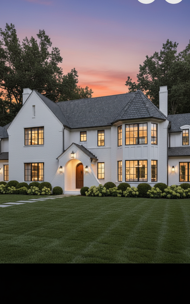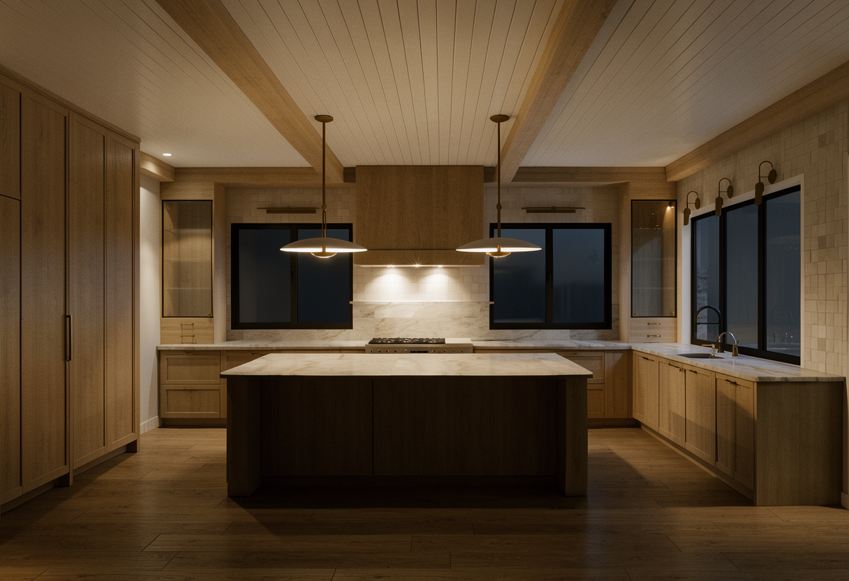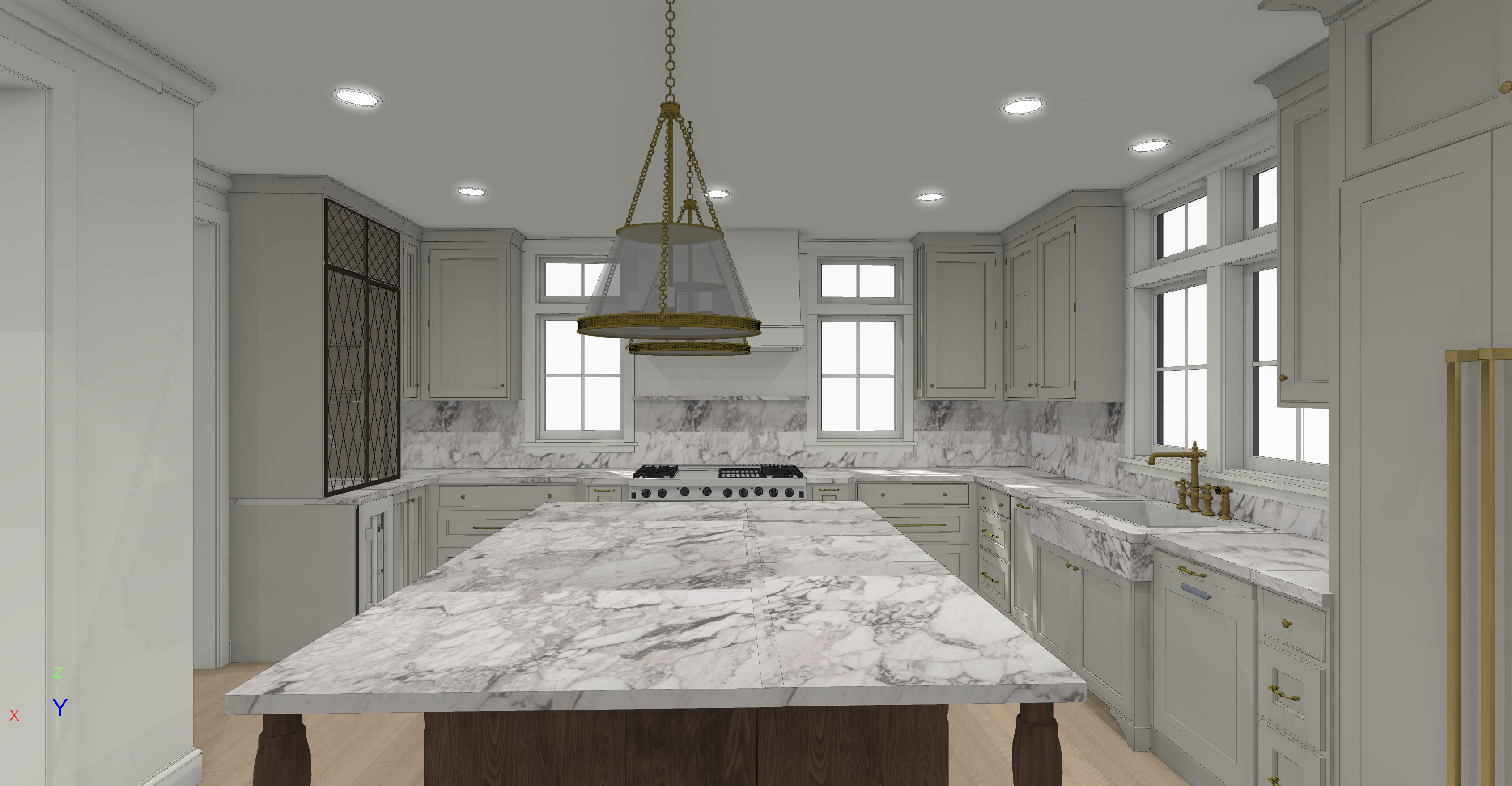make a dreamy hdri rendering of this space the only thing i need to change the diamond grids on the doors should all be the same height depth do not decorate anything and make the posts to the island a little more spindley the glass is clear glass the light should be 2700k the cabinet color is edgecomb gray by benjamin moore do not change any cabinet details