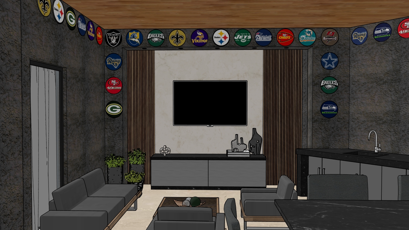ultra realistic architectural visualization of a modern outdoor patio bar natural warm sunlight no artificial lighting the tv is flanked by warm wood slat panels lambrin the ceiling features a matching warm wood deck texture walls are finished in a sophisticated dark grey stucco the grill bar is made of polished black granite modern furniture in high quality grey fabric decorative elements include hyper realistic lush plants and minimalist sculptures an nfl bottle cap frame team logos rendered as highly detailed metallic bottle caps corcholatas with realistic reflections and textures 8k resolution cinematic composition photorealistic textures soft shadows the window should be darke