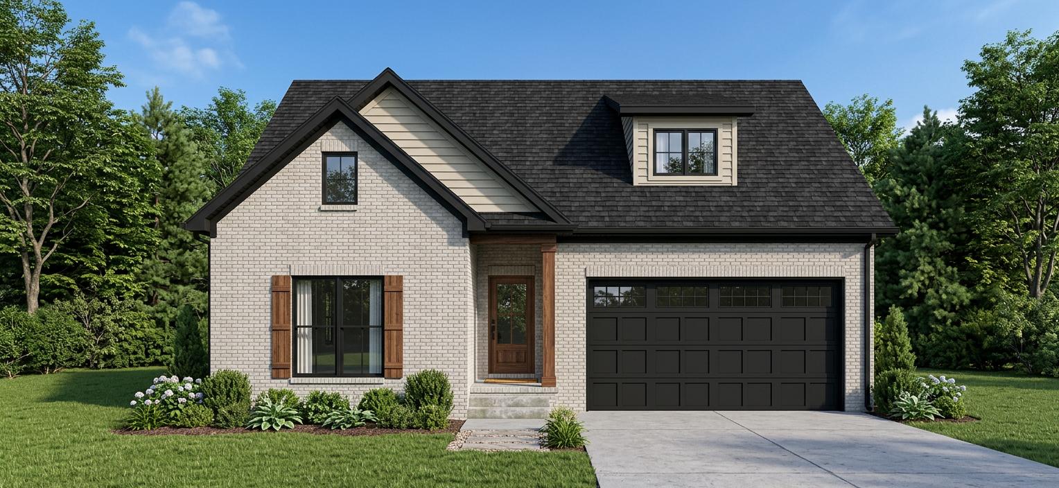 charcoal board and batten horizontal wood planks white wash brick hedges in front left corner