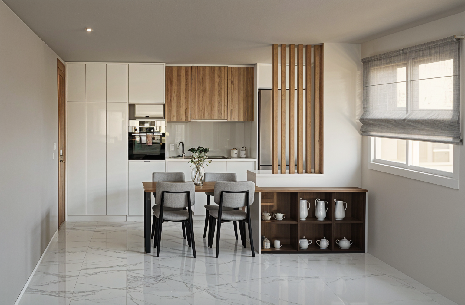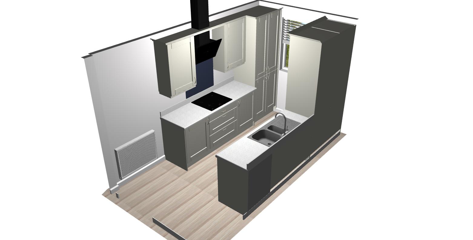 render with porcelain kitchen doors shaker style and light oak flooring with a light marble laminate worktop add lighting
