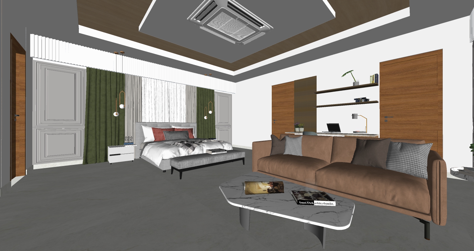 create a realistic render with cove lights in the ceiling provide illumination for the light fixtures and retain the white marble flooring