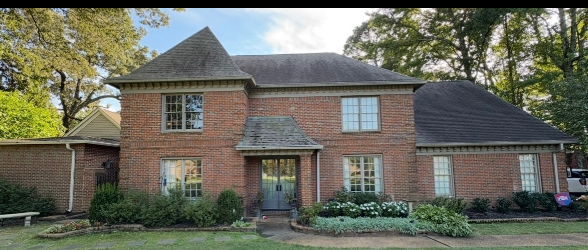 create a photorealistic exterior renovation of a traditional two story suburban brick home important keep the existing warm red brick completely unchanged do not alter the structure or size of the home or windows updates paint all trim fascia soffits and window frames benjamin moore cromwell gray a soft warm gray replace all windows with casement style windows no more double hung while keeping the same size and placement windows should have full divided light grids with thin refined mullions not thick or colonial style in the fascia put a large cove moulding vs the vertical lines shutters add flat panel shutters to all front windows paint shutters a deeper color sherwin williams porpoise deep warm charcoal shutters should be properly scaled to window width not narrow or decorative front entry redesign the front door area with a deeper canopy roof the canopy should have a very subtle curved slightly arched profile finish that new canopy in deep bronze standing seam metal add two large 8x8 square cedar posts supporting the canopy cedar posts should be lightly stained medium natural brown not orange not too dark style should feel clean modern and architectural gutters add copper gutters and downspouts style modern traditional inspired by chris loves julia moody tonal elevated and cohesive no white trim anywhere lighting camera natural daylight soft shadows straight on front elevation view eye level perspective make the image highly realistic and architecturally accurate