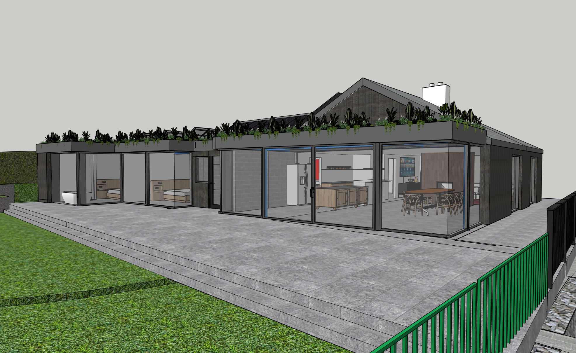 bunglaow iwth floor to ceiling glazing on flat roof extension burnt larch cladding grey kilkenny limestone patio planting on roof edge