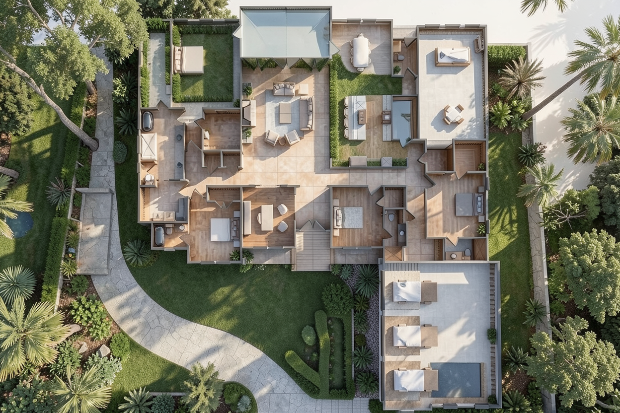render realistic using white stucco with mixed brown color stone and black windows black accents black doors and black roofs set this is a residential neighborhood with large mature trees and very upscale landscaping provide shrubs and landscaping around the base of the house make the surround of the front door black and make the time of day dusk with lights add outdoor lighting next to front door and can lighting in the soffits add a driveway going to the side yard on the right side stop adding more building on the right side and left side