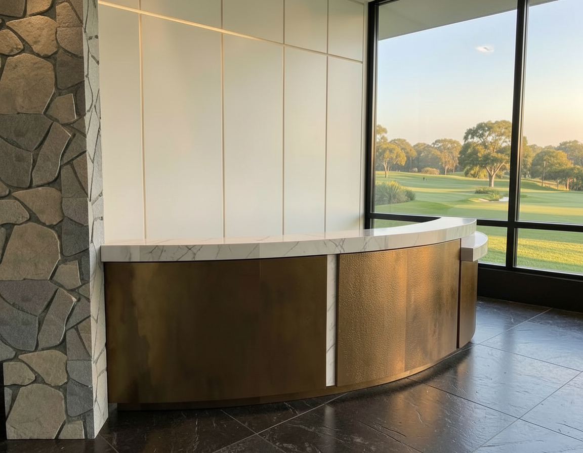 golf course community light beige brick and light colored stone black roof and windows lush landscaping and vibrant blue sky maintain all details
