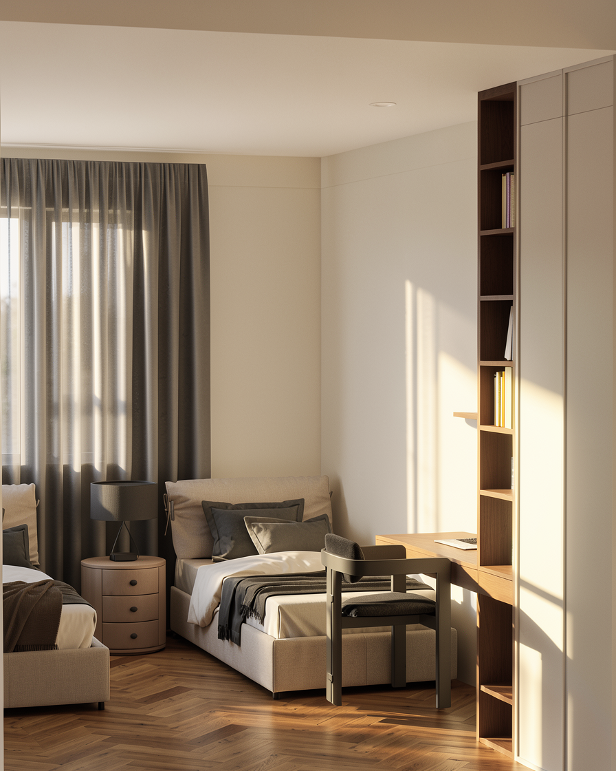 minimalist modern home office interior warm neutral color palette vertical fluted wall panels in light beige custom floating wooden desk in dark walnut integrated led strip lighting under floating shelves thin brass or champagne metal shelf edges soft indirect lighting floor to ceiling sheer curtains contemporary upholstered chairs with metal legs calm luxury atmosphere scandinavian japanese japandi style high end interior design clean lines realistic materials soft shadows photorealistic render ultra detailed 4k natural daylight interior architecture photography
