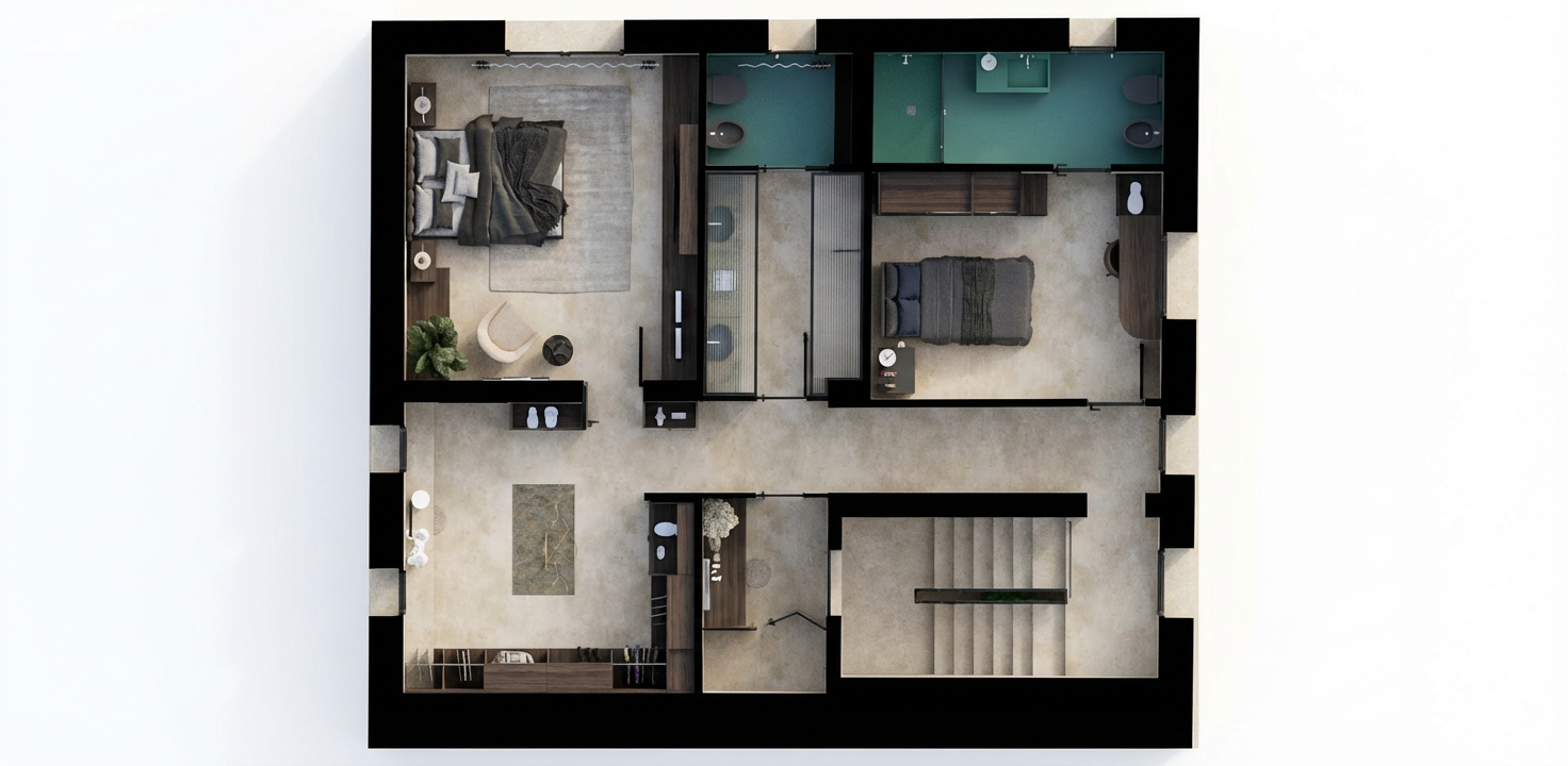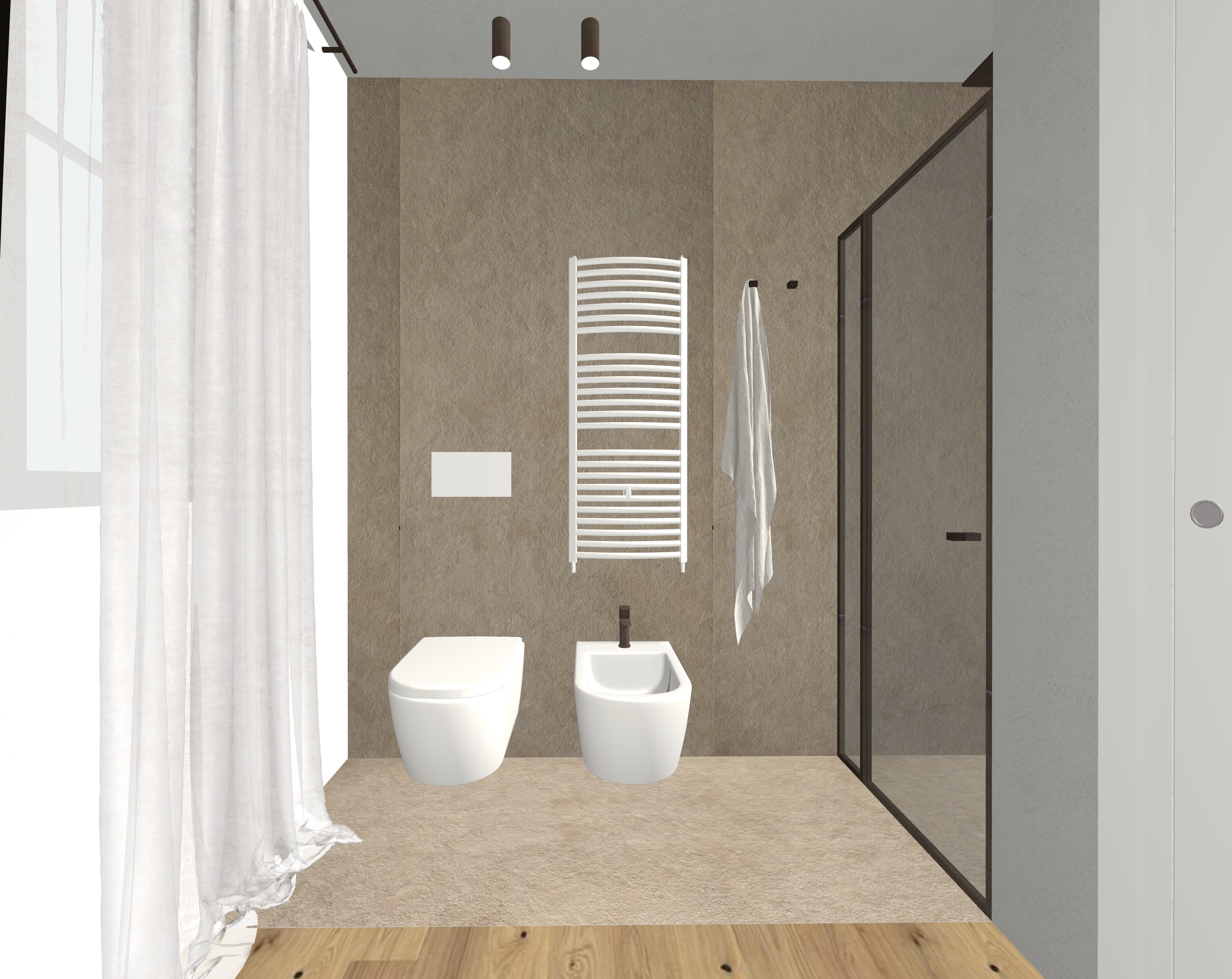 bagno con sanitari bianco opaco e rubinetti in finitura bronzo il rivestimento in pietra non poroso i due faretti a soffitto sono accesi il box doccia in vetro trasparente la parete di destra sinistra e il soffitto sono in finitura calce bianca