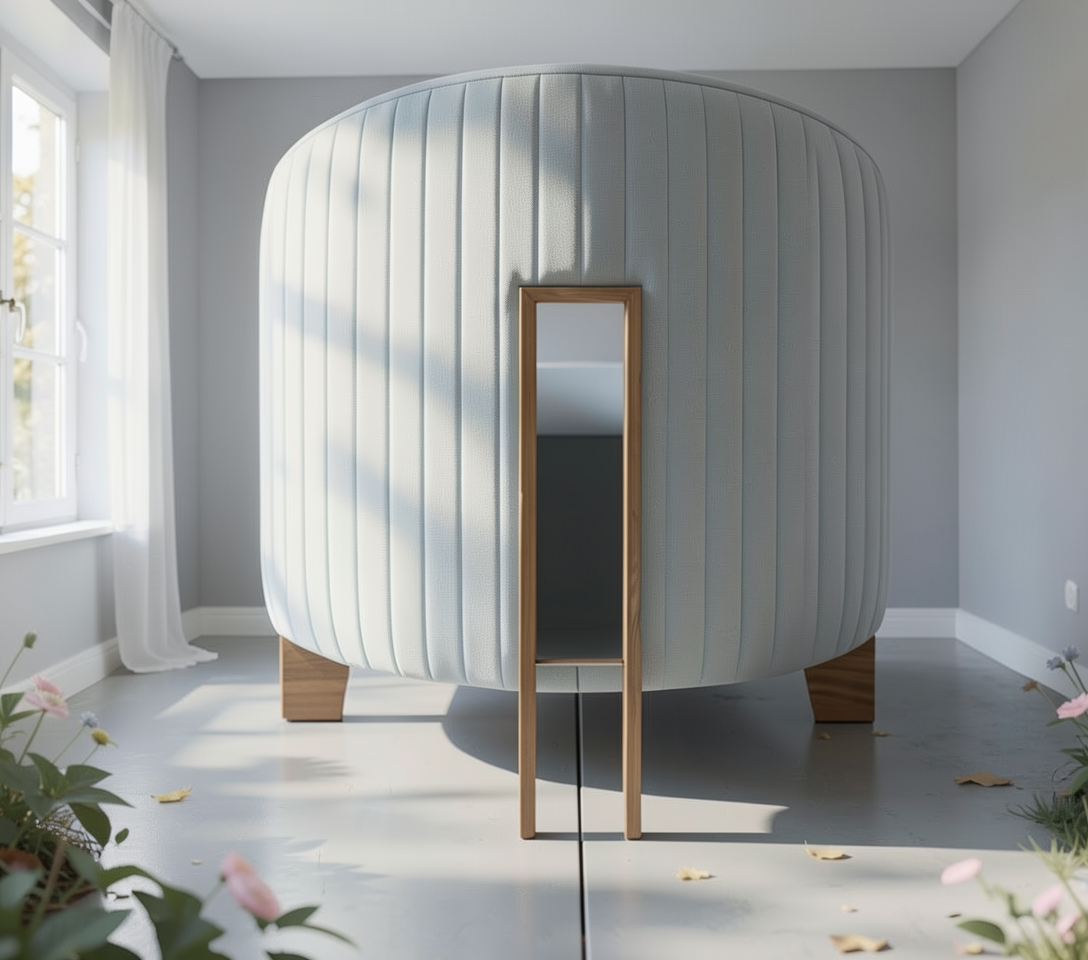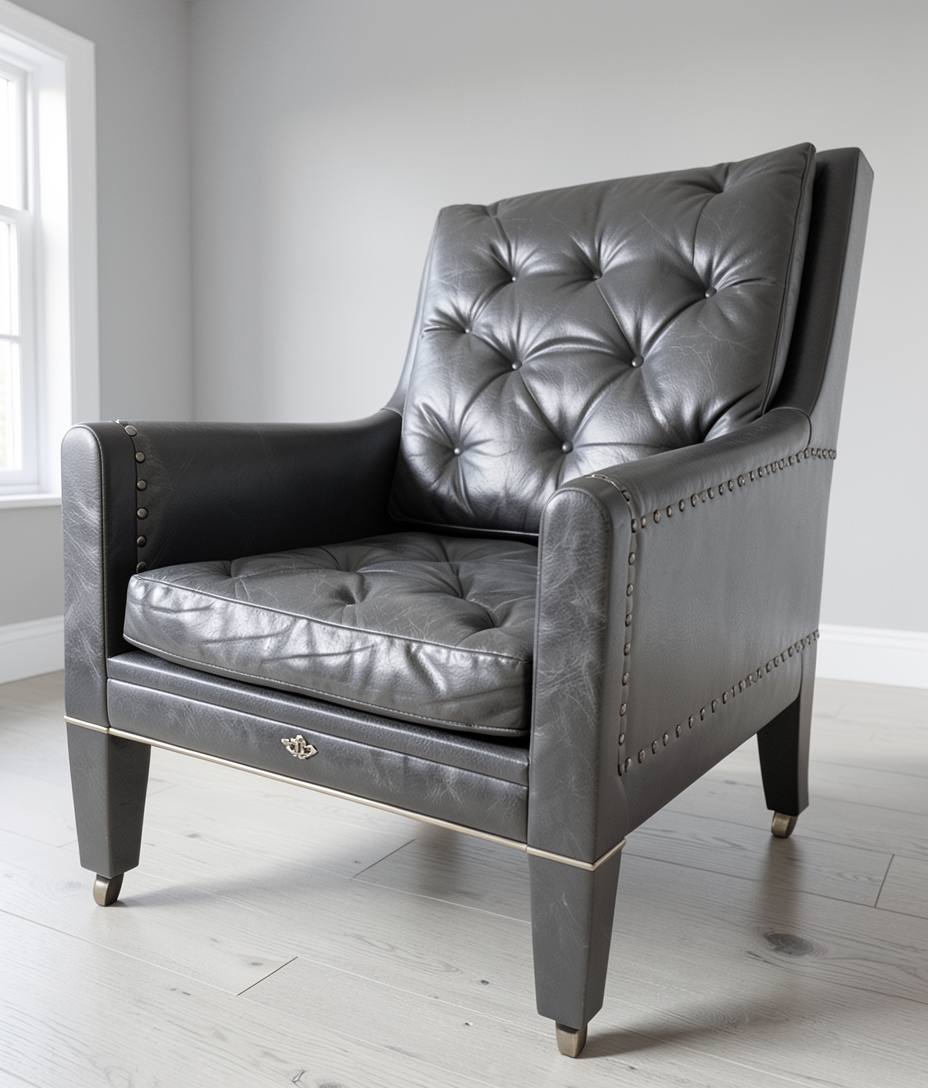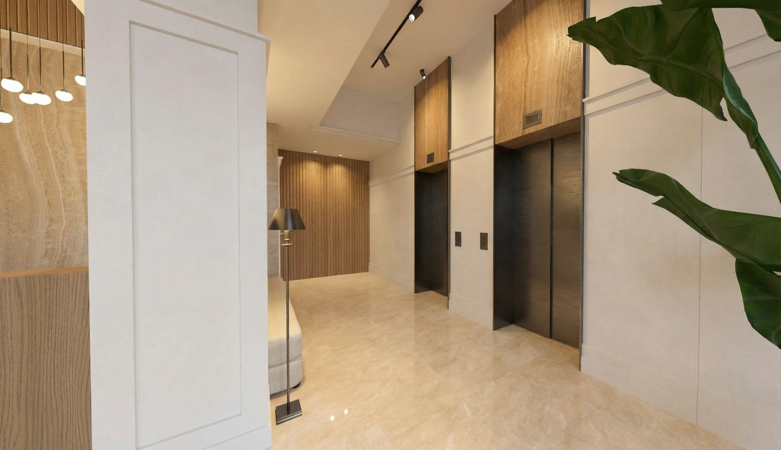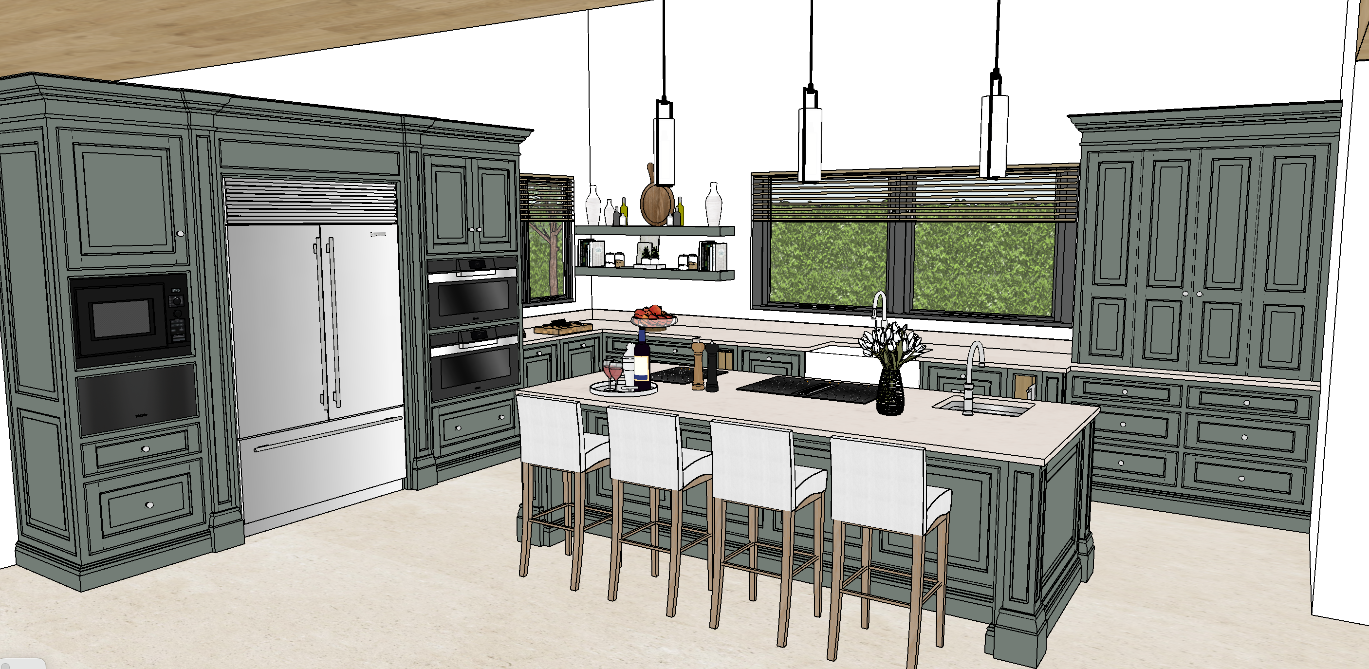 render a luxurious and modern kitchen with deep sage green cabinetry featuring elegant panel designs the countertops are a light white marble that reflects a soft ambient light the kitchen island has matching sage green details with luxury white bar stools adding contrast large stainless steel appliances seamlessly integrate into the cabinetry above the island hang three sleek modern pendant lights in matte black the window shows a vibrant lush green landscape complemented by wooden blinds the room atmosphere is warm and inviting with a natural light streaming in casting subtle shadows the floor is a smooth light beige stone enhancing the elegant and serene vibe