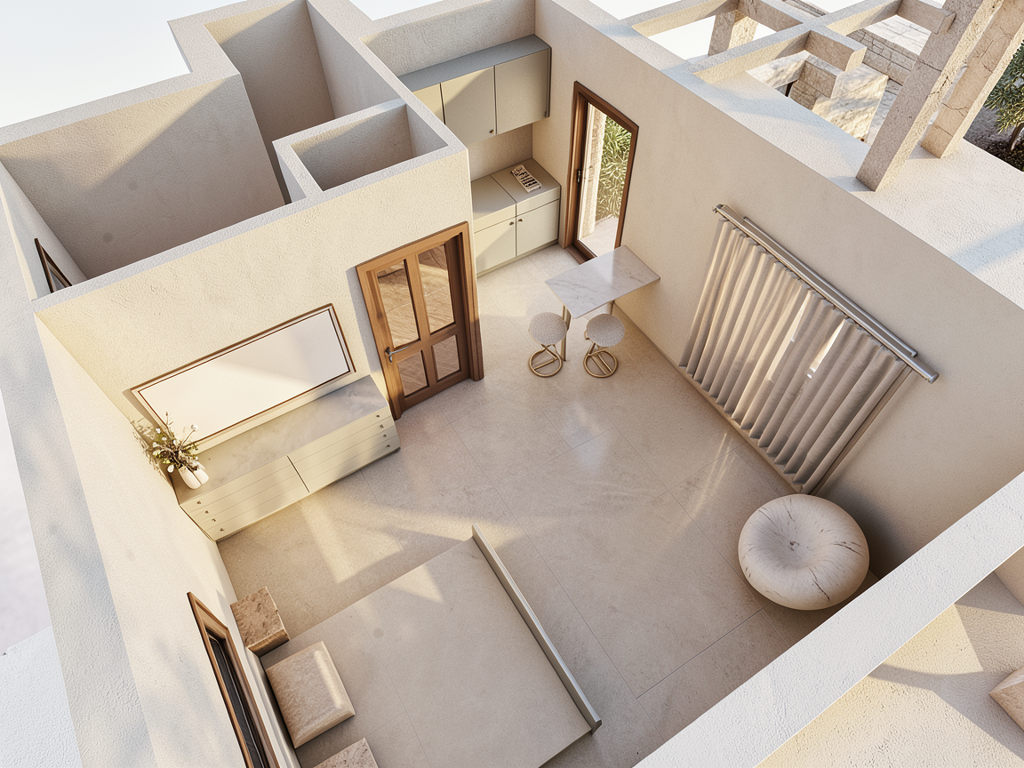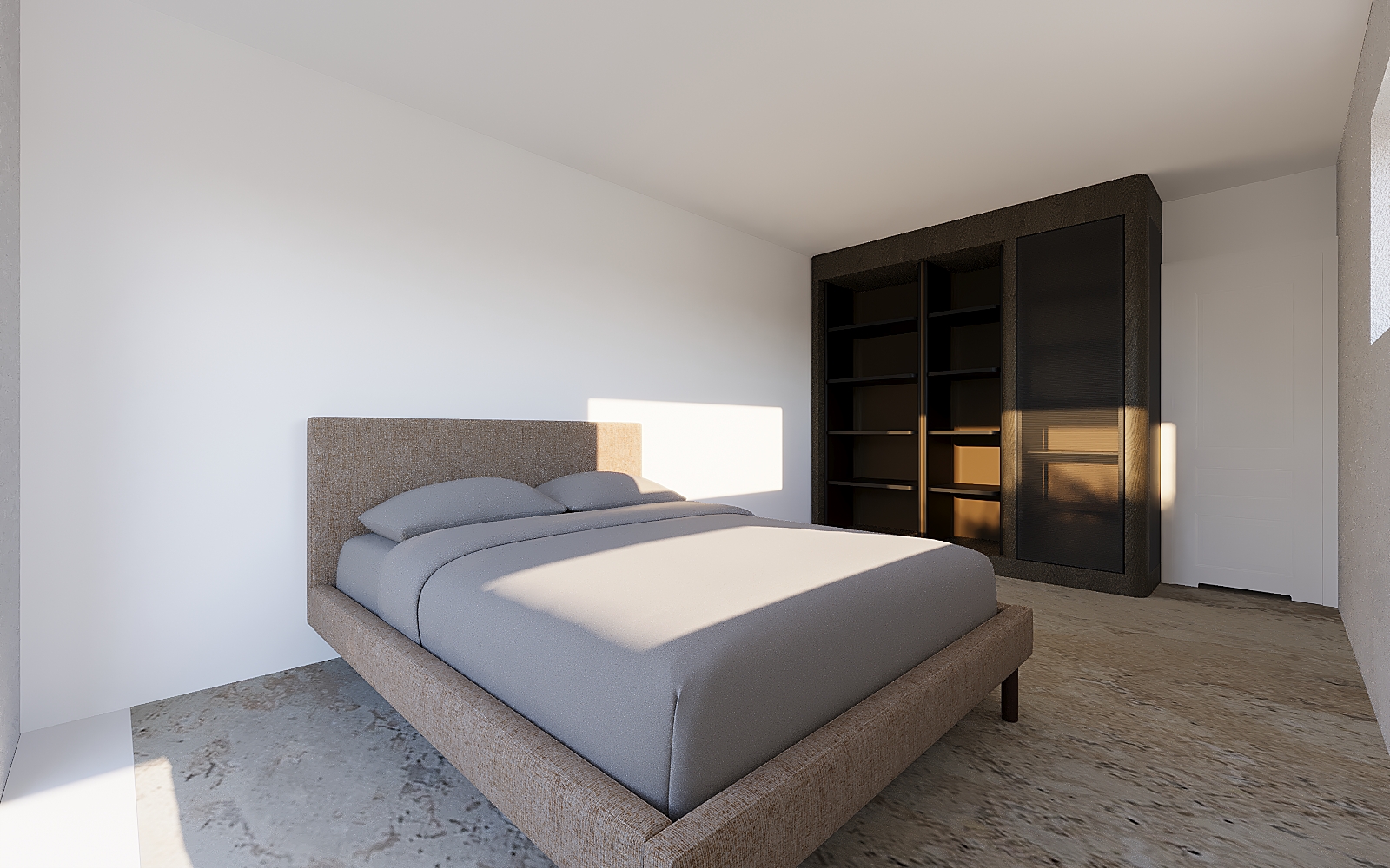 guest bedroom jerusalem stone flooring nice clear beige bouclette tones bed with brown cushions and with wood panels on the wall behind the bed side tables with lamps on them and plug and switches canon de fusil on the wood panels transparency with led in the closet one hanging part one drawers part ceiling with a contemporary molding in periphery and led indirect