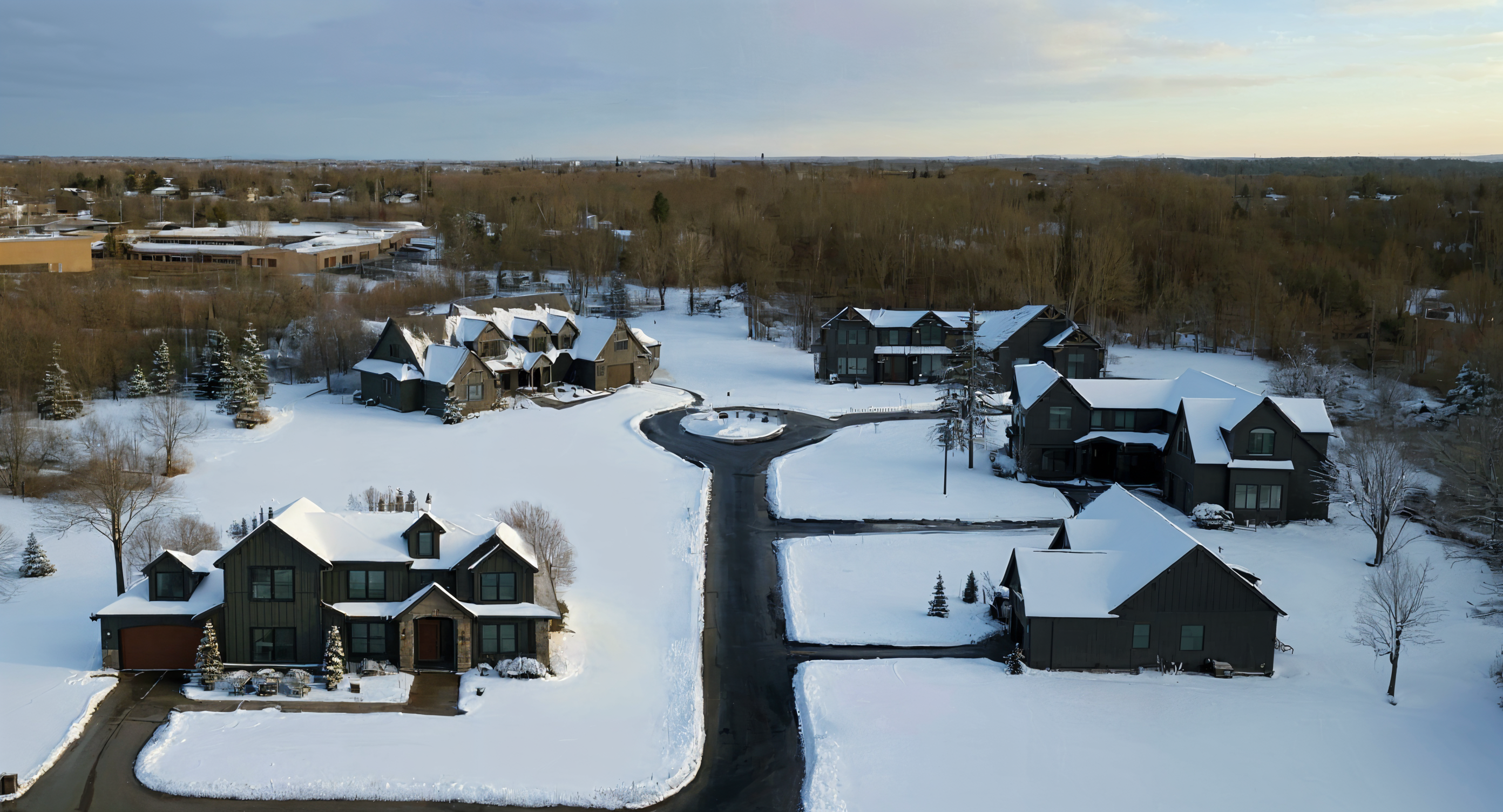 i need the top left house have a driveway visible going from the garage to the street i need the lower right house to look white with black trim and the middle right house to be dark blue