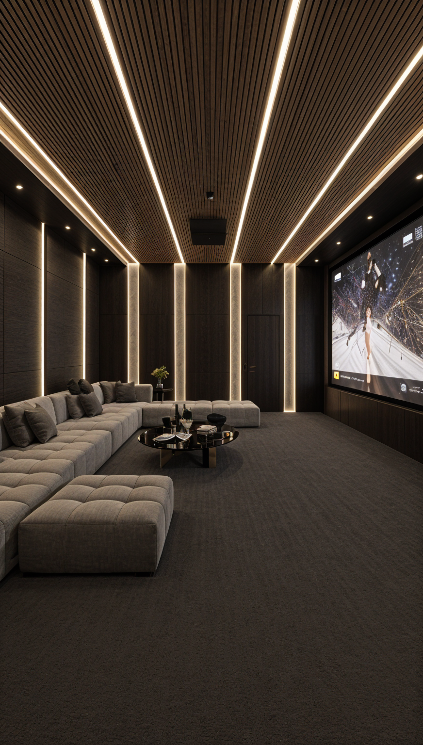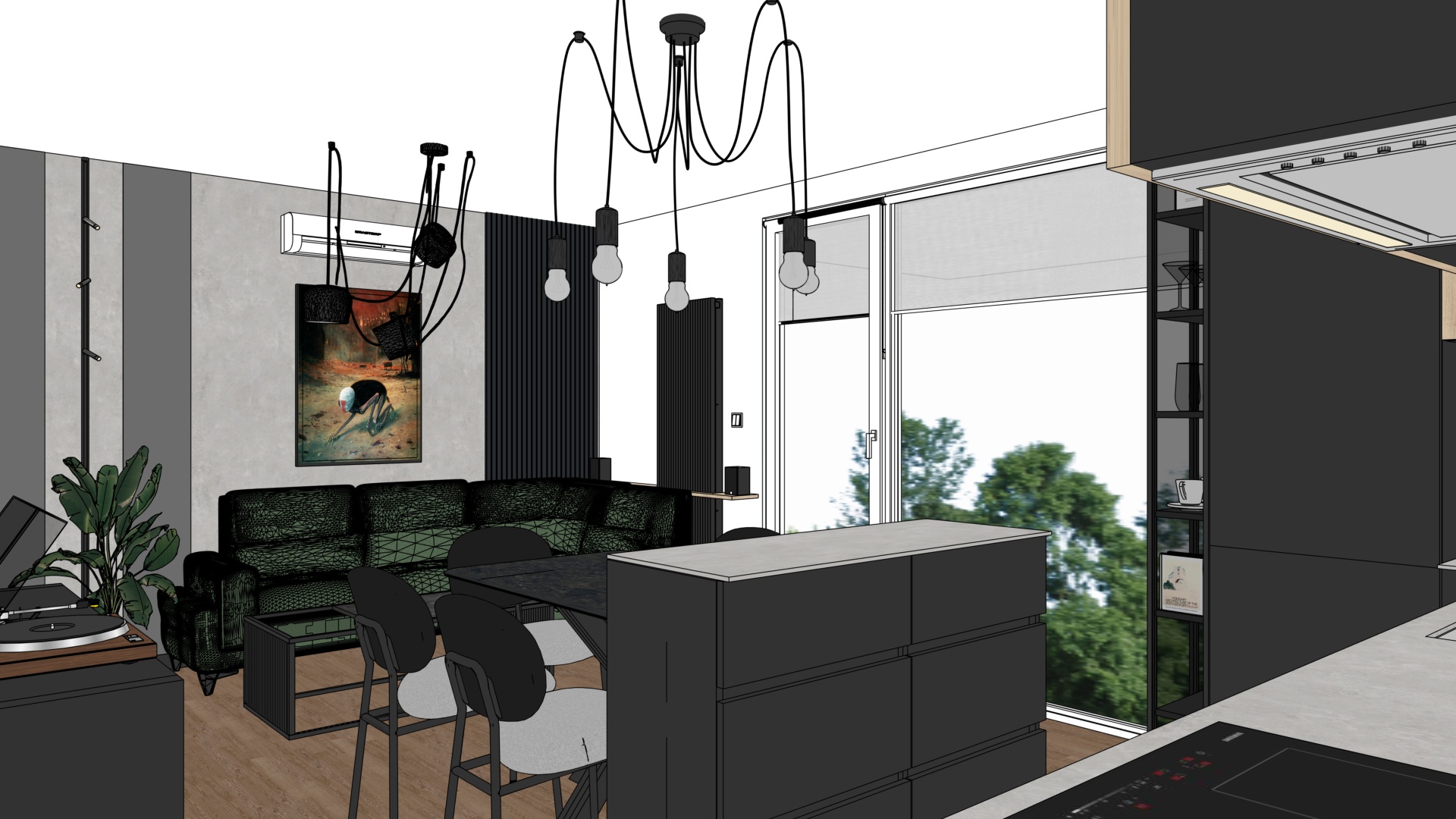 loft style apartment interior for single man open plan living room with kitchen masculine industrial aesthetic bottle green corner sofa with textured upholstery decorative wall behind sofa finished with subtle concrete plaster texture light walnut wood floor panels black vertical slat panels behind sofa in right corner two vertical smoked glass mirrors on the right wall black ceiling mounted track light with three adjustable spotlights placed between mirrors matte black kitchen fronts with clean minimalist lines compact concrete look countertop with fine texture black dining chairs with thin grey seat cushions black metal details large glazing with view to balcony and outdoor terrace natural daylight realistic shadows balanced contrast eye level camera wide angle but without distortion straight perspective ultra photorealistic interior render high material accuracy realistic fabric concrete and wood textures calm but strong visual character