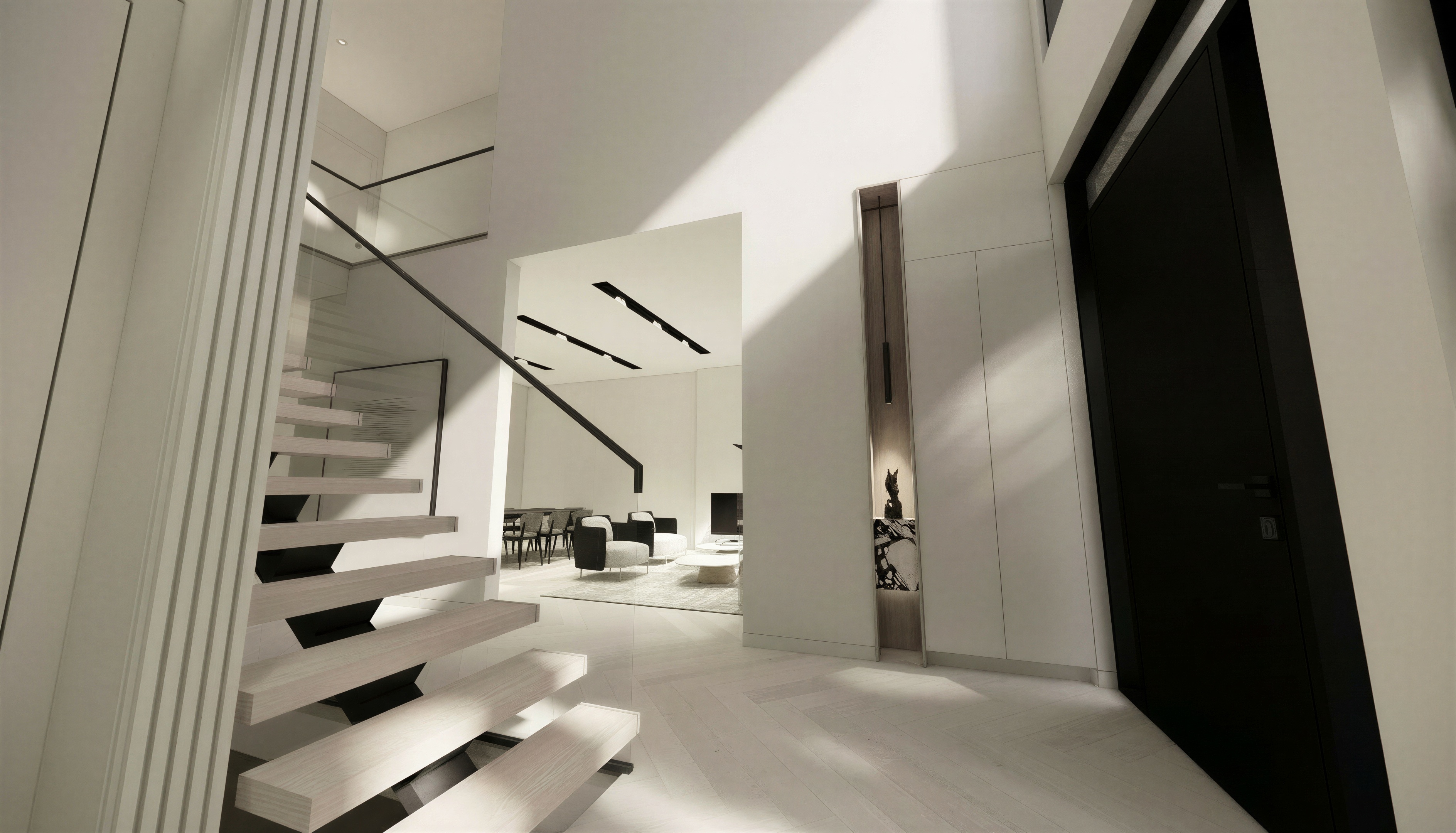 keep all the colors and materials very very light white oak herringbone hardwood for floors and same color of wood for stair steps very light white oak herringbone hardwood for floors and same color of wood for stair steps feature wall behind the stair is white fluted panel