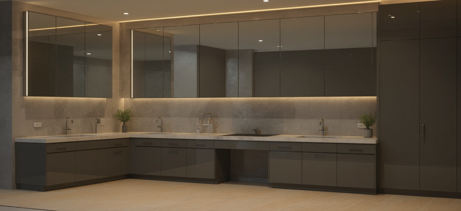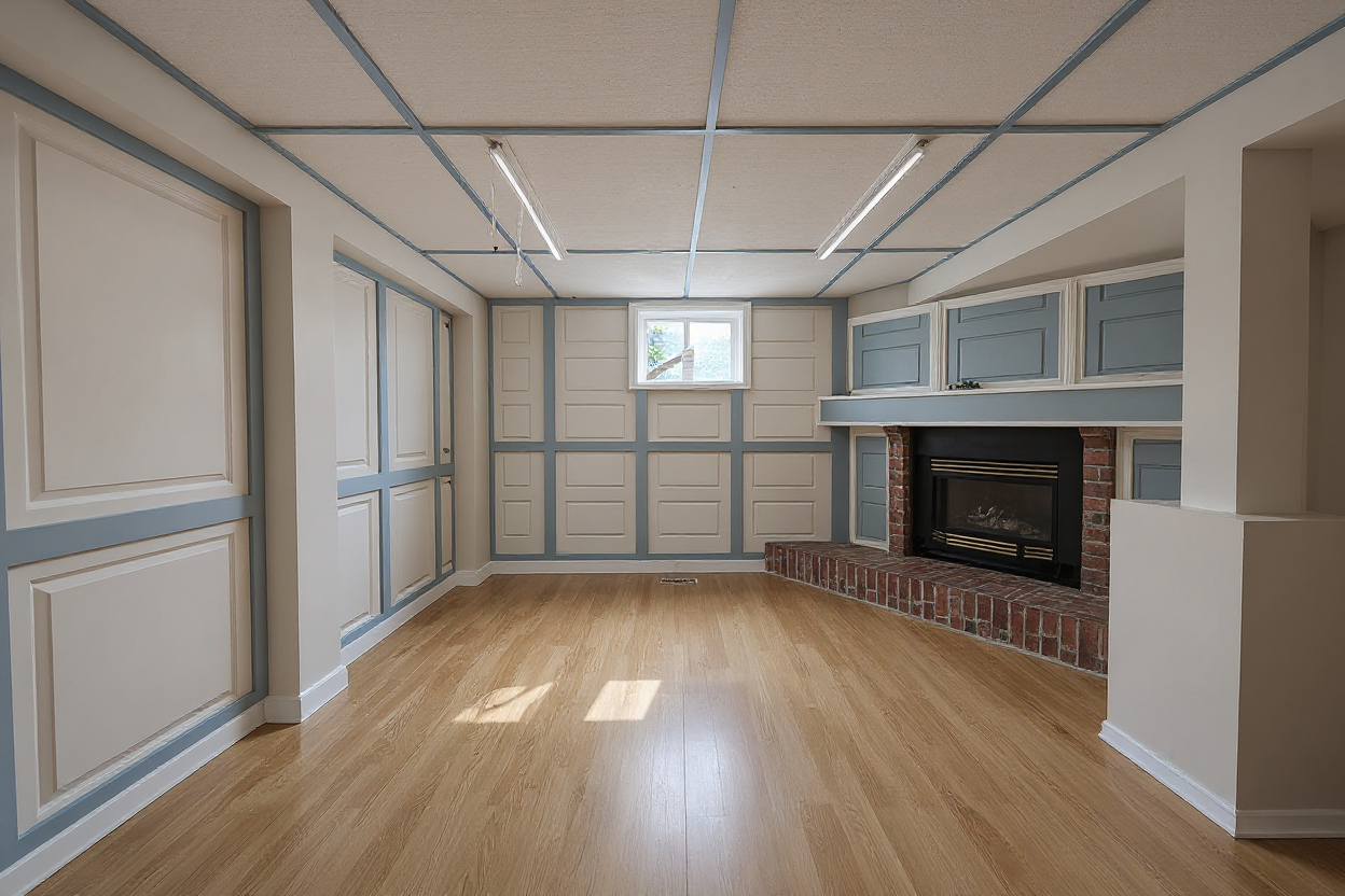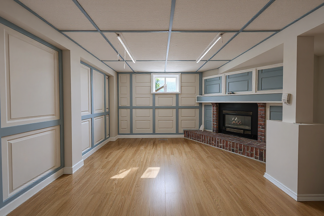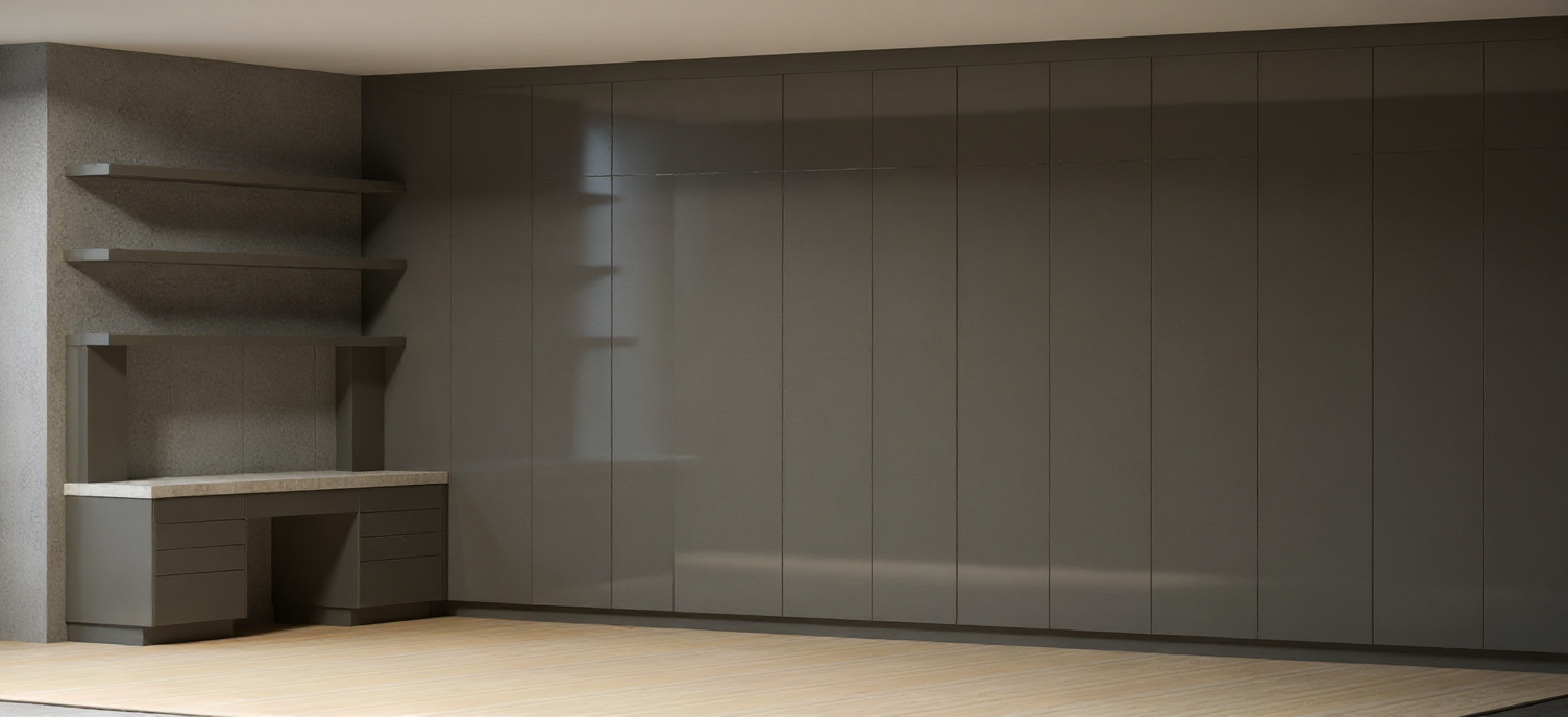 sustainable design interior shot american oak wood flooring herringbone pattern particularly open shelf sage green fabric sofa cream white cabinets dark burnt wood long desk architecture