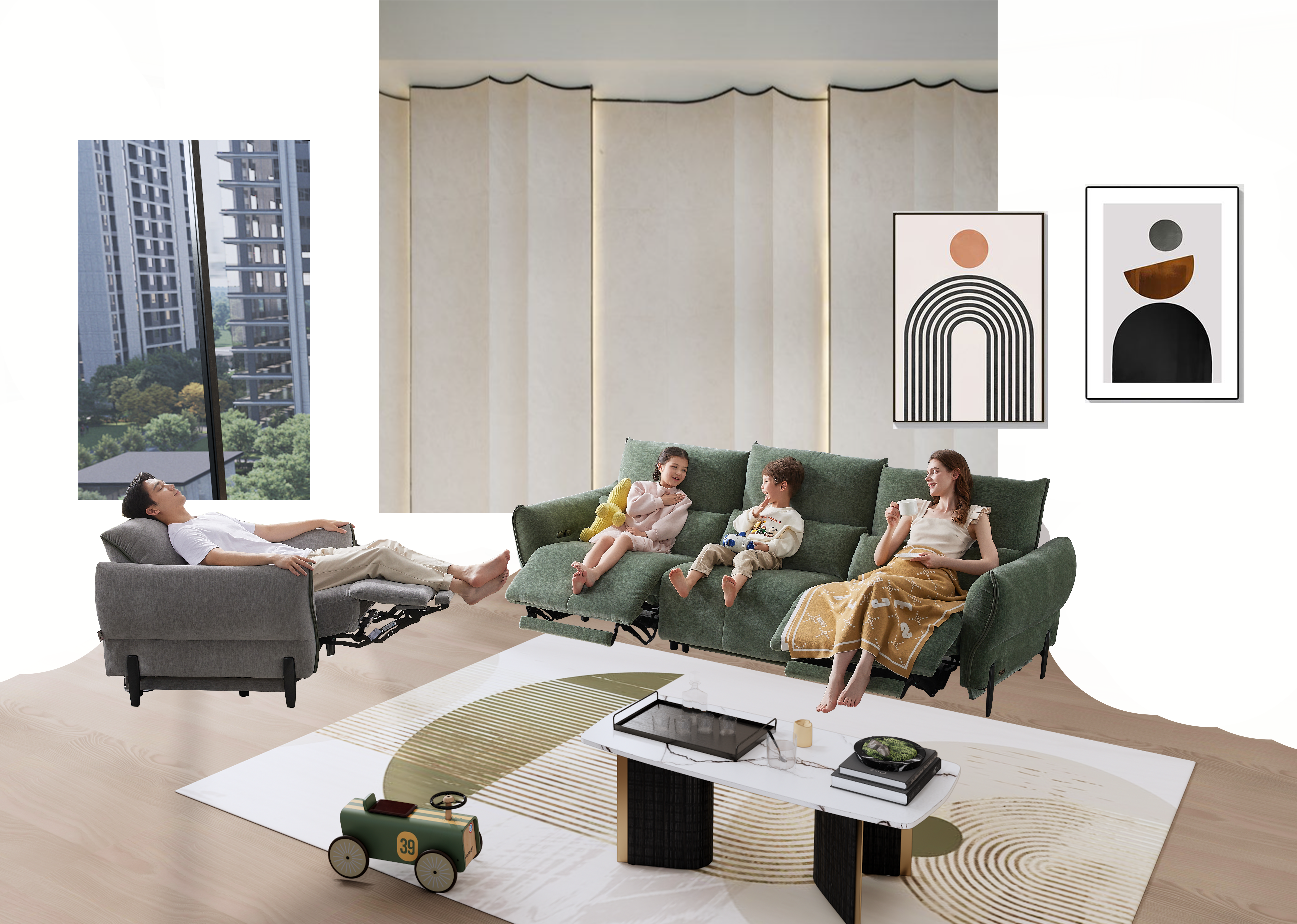create a luxurious and elegant living room with a soft dark green velvet sofa and a sophisticated gray chaise longue with black cushions adding a touch of opulence a modern square coffee table and a stylish side table both with dark wood bases and white marble tops take center stage a stylish metallic floor lamp adds mood lighting a textured gray stone wall backdrop soft beige curtains and a cream colored rug create a warm and cozy atmosphere minimalistic abstract art and decorative plants accent the dining area creating a warm and elegant french ambiance