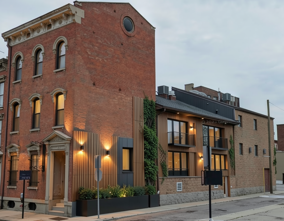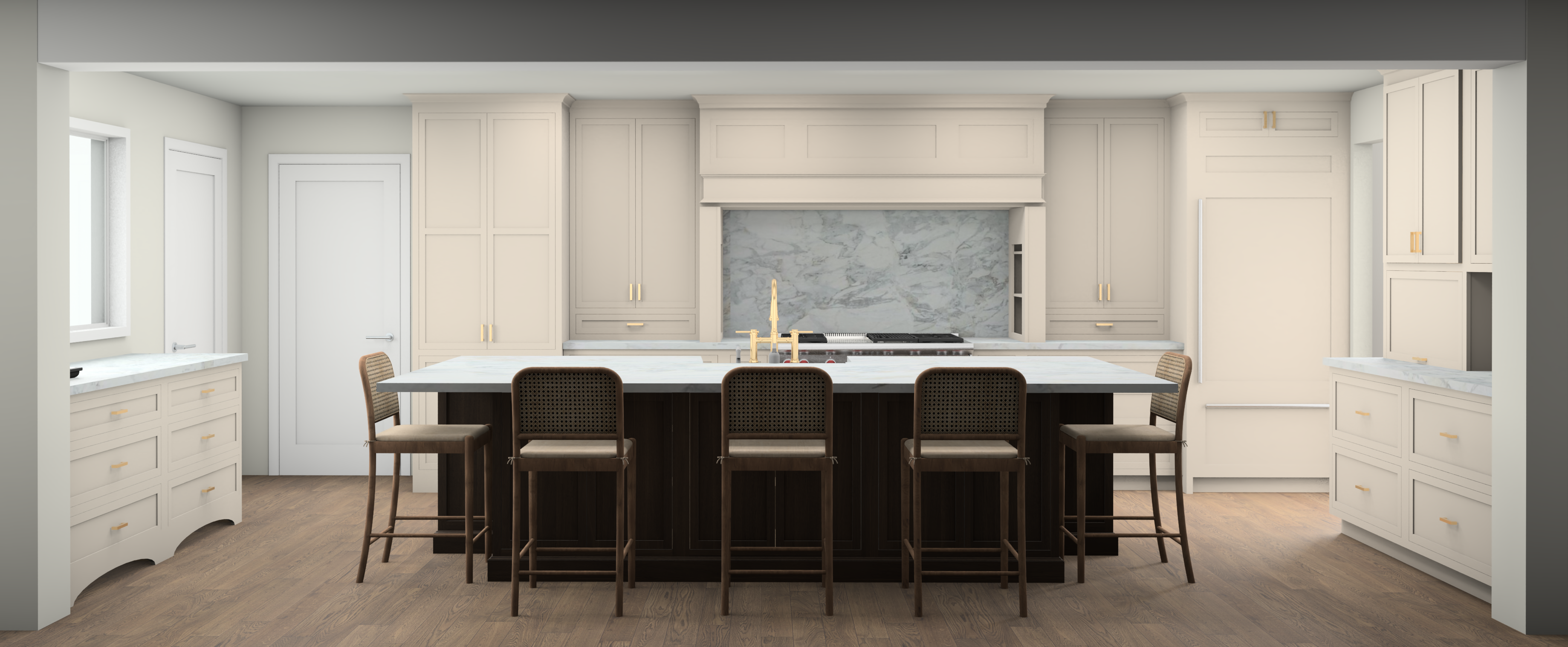 make more realistic add trees outside window add 2 pendant lights in gold centered over island
