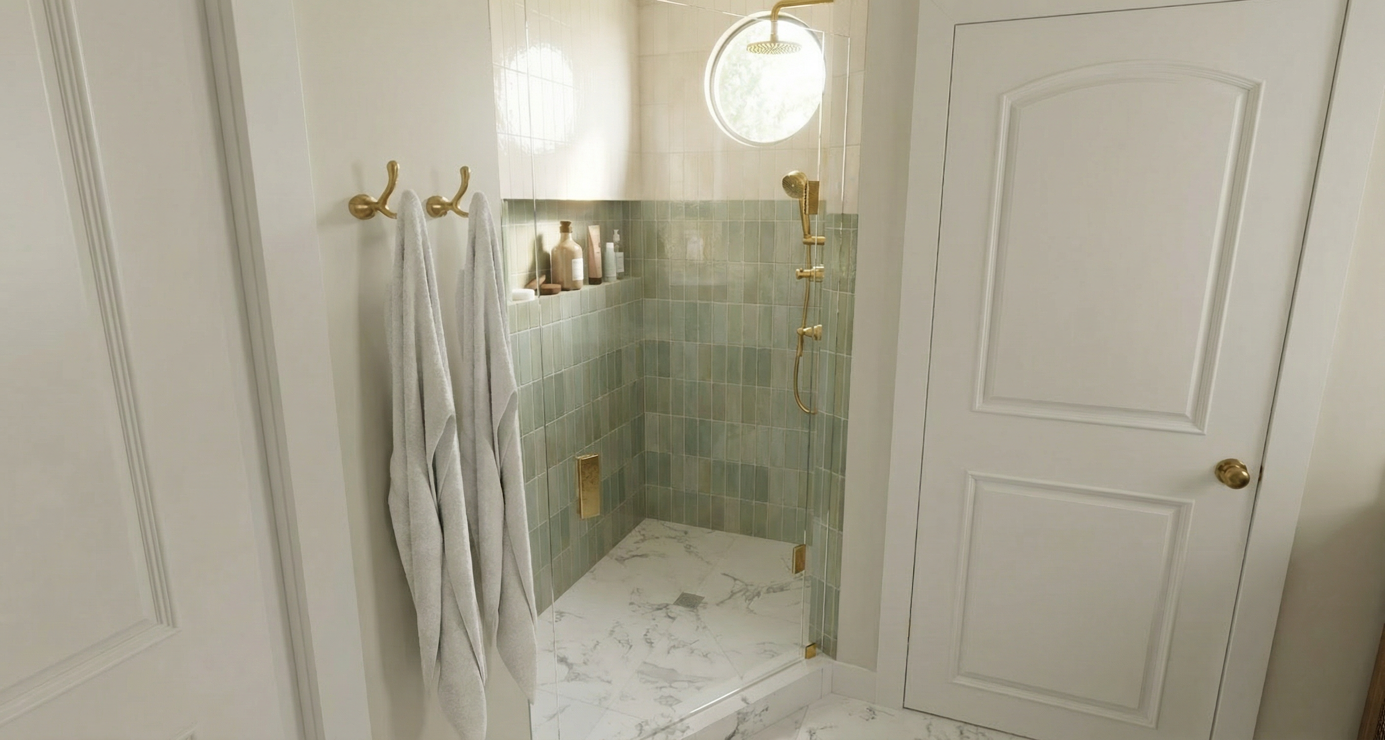 create rendered aerial floor plan with warm neutral floor plan and pops of accent colors in accessories white king bed at bedroom white sofa and club chair at living room green turf at golf simulator white marble floors and glass shower enclosure inside bathroom kitchen has white marble countertops and stainless steel refrigerator warm medium wood flooring white draperies with geometric pattern at windows along top wall